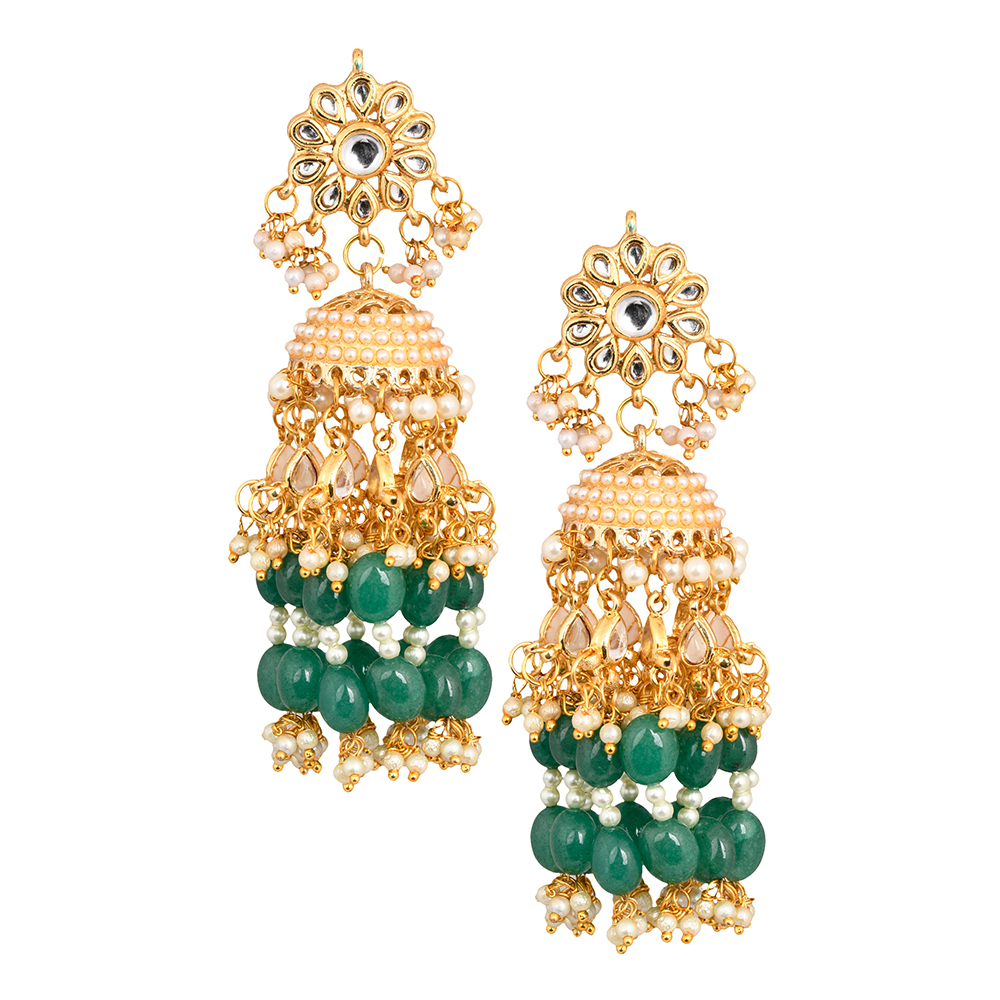 The Floral Mirror Dome Earrings with Green Beads & Pearls Pair is crafted for occasions that demand elegance and presence. Made in brass with a luminous gold tone finish, these 4.30-inch earrings feature a floral mirror top that transitions into a beautifully structured dome silhouette. Cascading green beads and pearl drops add movement and rich festive texture. Bold in size yet graceful in detailing, they embody traditional grandeur with refined craftsmanship.