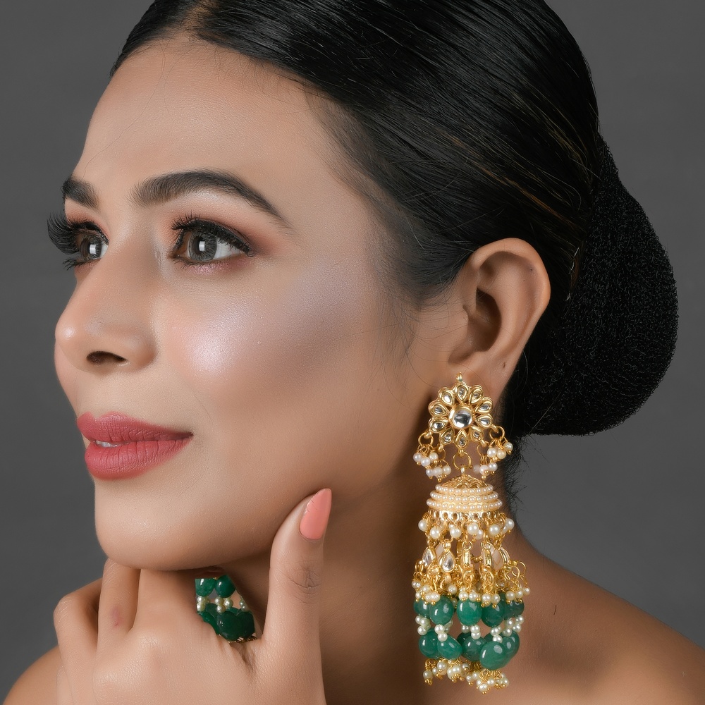 Pair these statement earrings with silk sarees or embroidered lehengas, and store them in a fabric-lined box to protect the mirror finish and bead clusters.