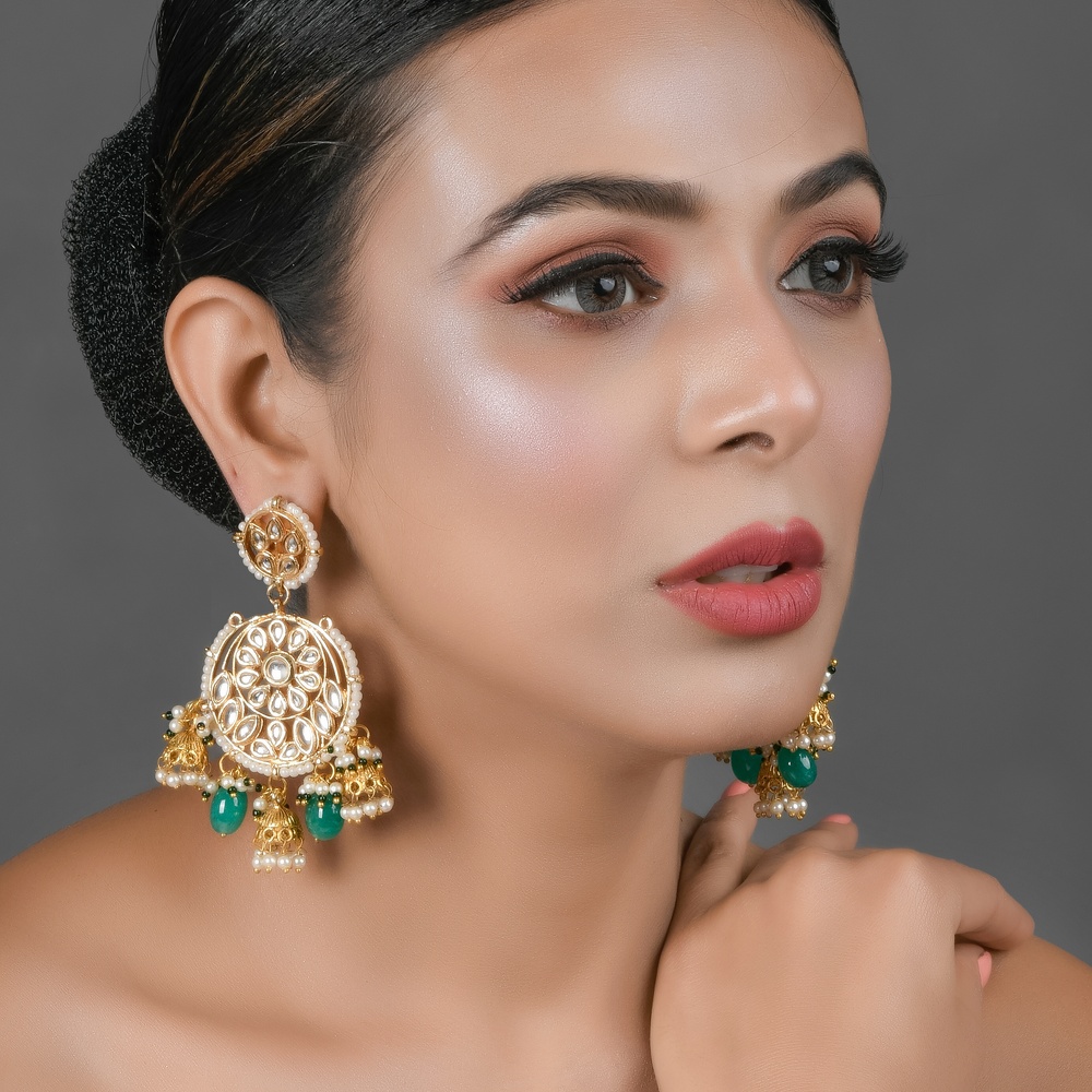 • Smaller mandala stud at the top and ornate jhumka drops with pearls and green beads