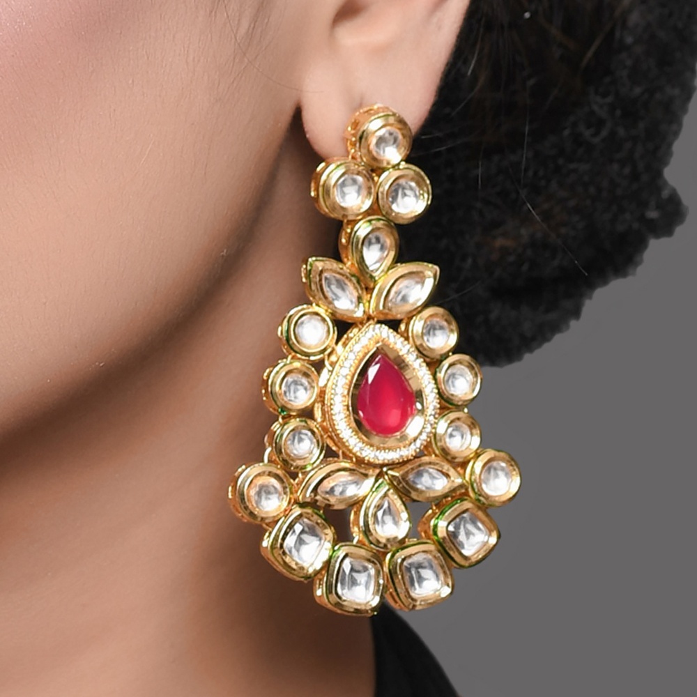 The Floral Mirror Stone Statement Earrings with Ruby Accent are designed to bring regal brilliance to traditional and celebratory attire. Crafted in polished golden brass, these earrings showcase intricate floral motifs highlighted with luminous white mirror stones. At the heart of each bloom rests a rich ruby-toned accent, adding depth and ceremonial elegance. With a bold 2.7-inch silhouette, this handcrafted pair creates a captivating festive statement.
