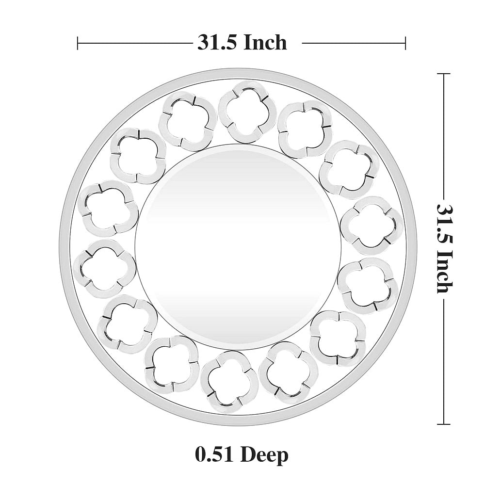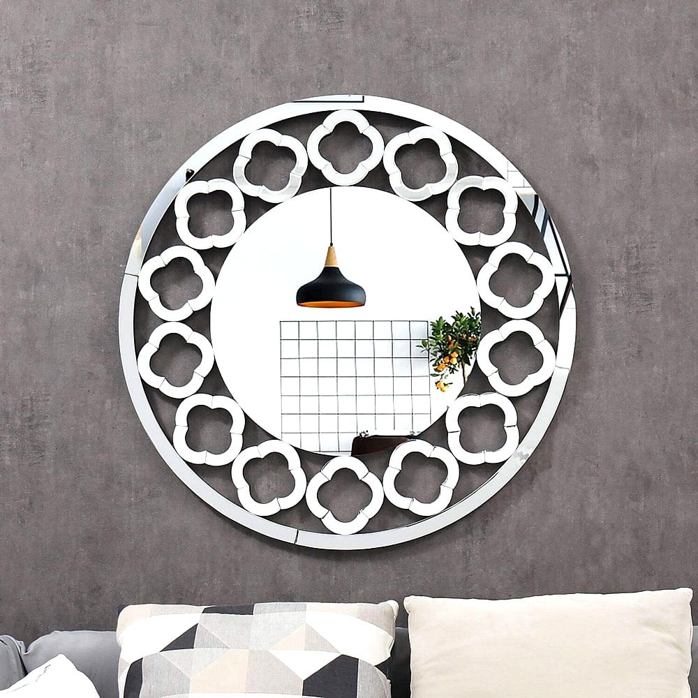 This round wall mirror is encircled by a decorative frame of repeating floral-shaped mirror elements, creating a refined rhythm around the central reflective surface. The evenly spaced motifs form a continuous ring that adds depth, symmetry, and visual softness. Elegant yet contemporary, the design balances ornamentation with clean geometry.