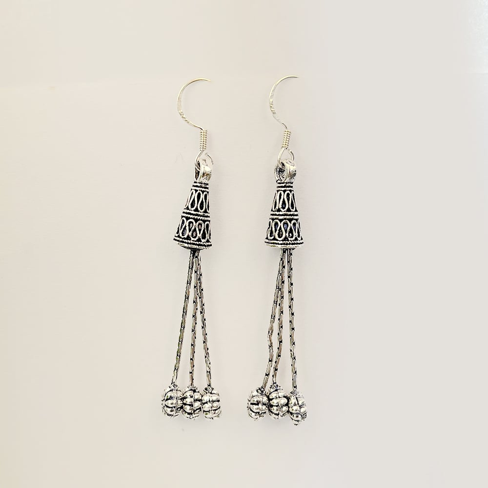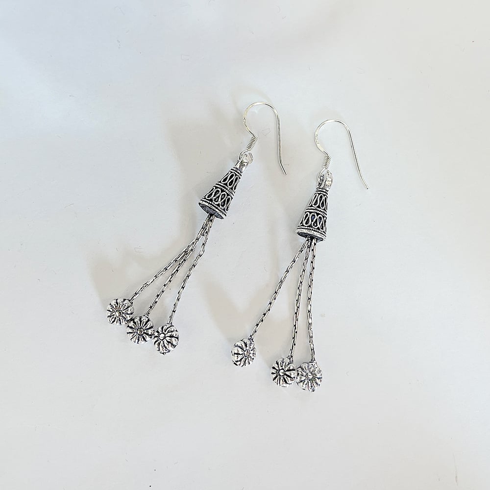 The multi strand hanging structure creates visual rhythm through movement while the floral cap adds a grounded handcrafted character. This balanced form delivers elegance without excess making it suitable for extended wear.