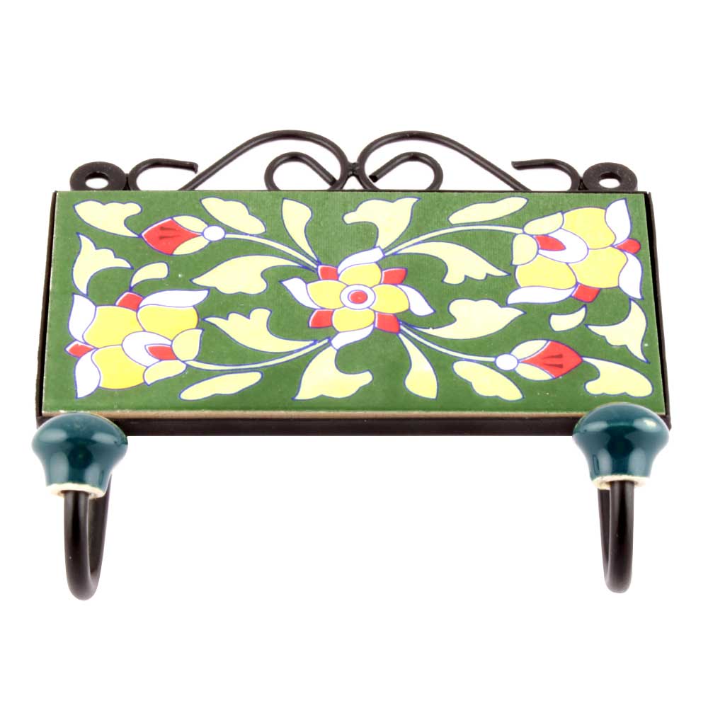 Forest Green Ceramic Flower Tiles Hooks. When Put on Wall or Cabinet it is an Art in itself. The Metal Part of this Hook is Black Powder Coated.