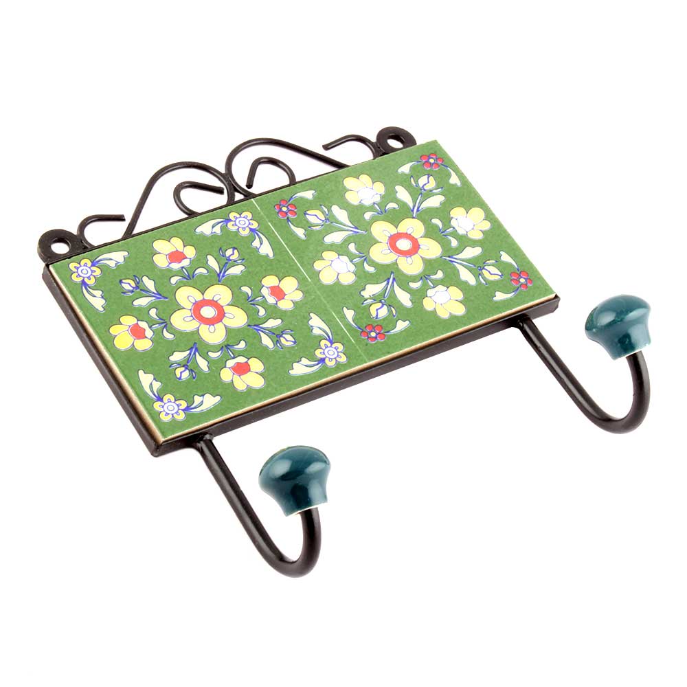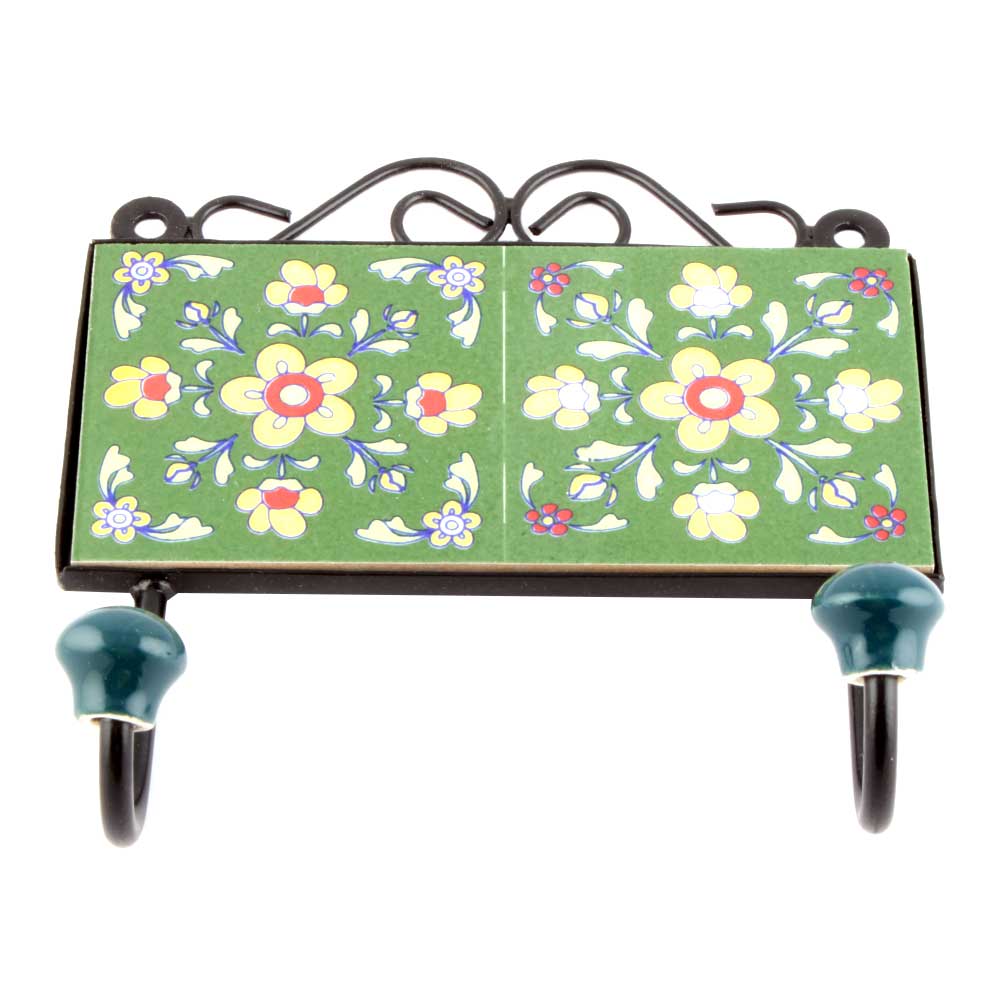 Forest Green And Yellow Tiny Floral Tiles Hooks. When Put on Wall or Cabinet it is an Art in itself. The Metal Part of this Hook is Black Powder Coated.
