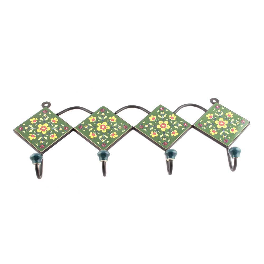 Forest Green And Yellow Tiny Flower Ceramic Tiles Hooks Online. When Put on Wall or Cabinet It is An Art in Itself. The Metal Part of this Hook is Black Powder Coated.