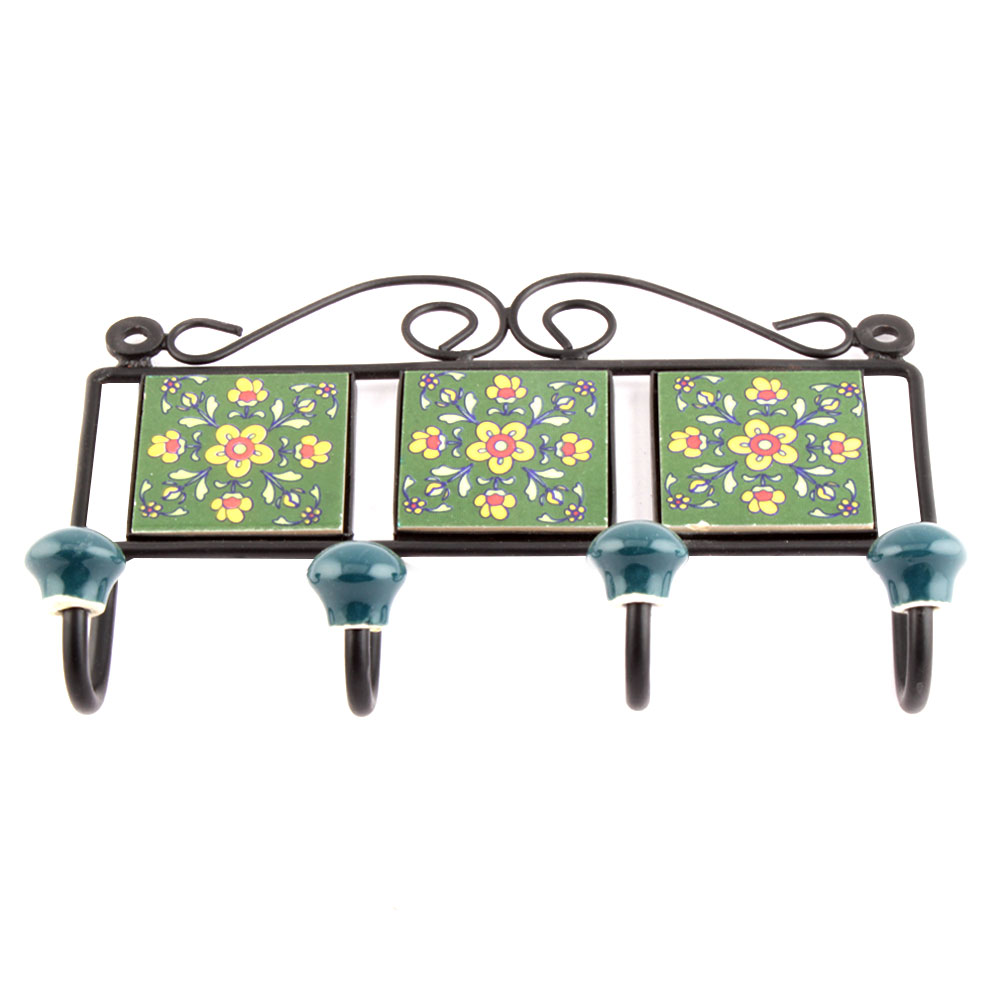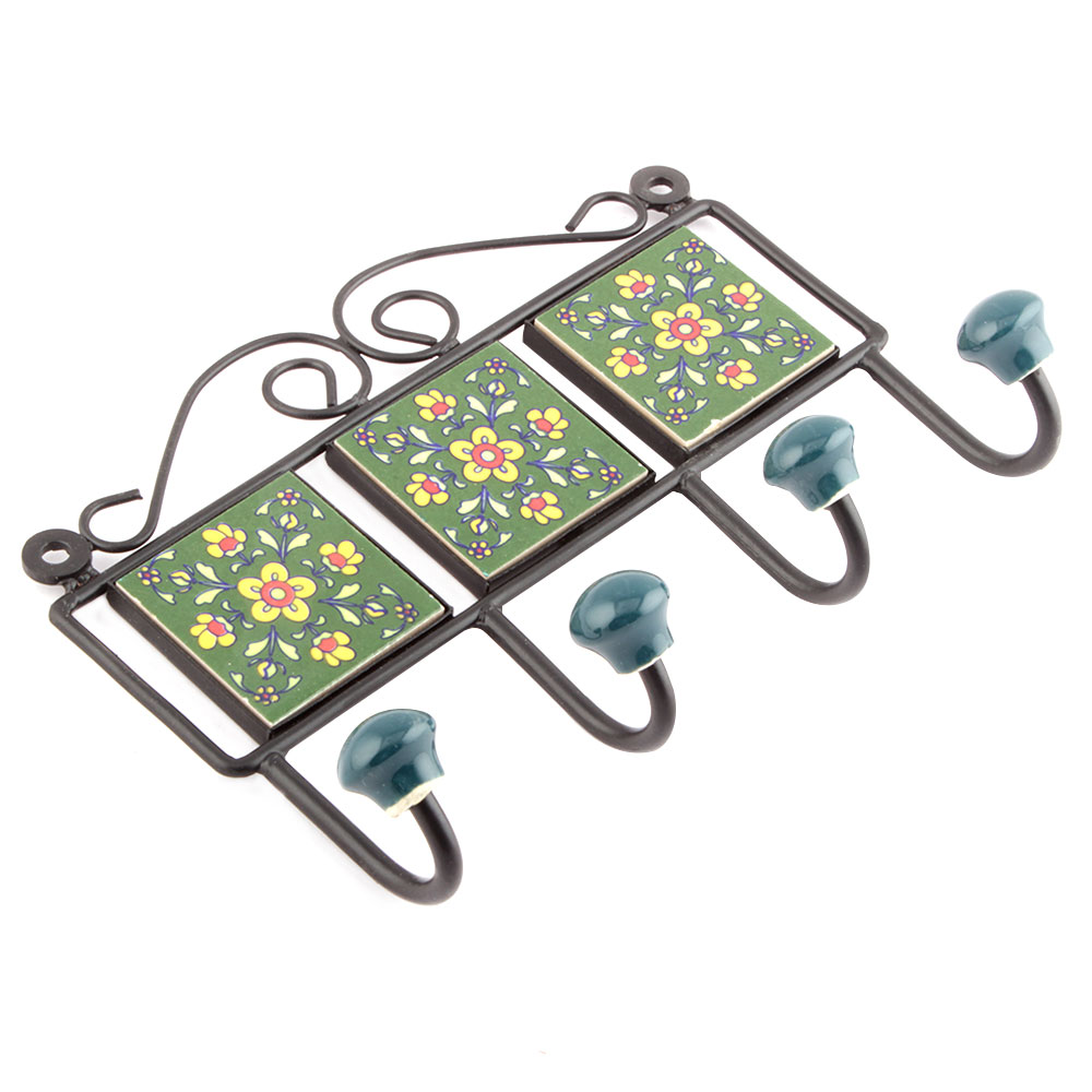 Forest Green And Yellow Tiny Flower Toiles Hooks. When Put on Wall or Cabinet it is an Art in itself. The Metal Part of this Hook is Black Powder Coated.
