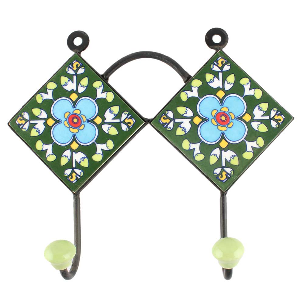 Forest Green Ceramic Floral Tile Hook. When Put on Wall or Cabinet It is An Art in Itself. The Metal Part of this Hook is Black Powder Coated.