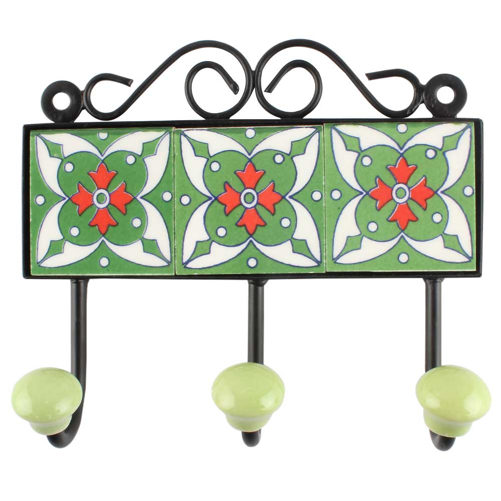 Forest Green Ceramic Floral Tile Hook Online. When Put on Wall or Cabinet It is An Art in Itself. The Metal Part of this Hook is Black Powder Coated.