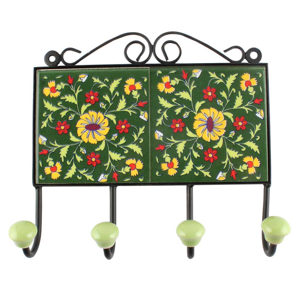 Forest Green Ceramic Floral Tile Wall Hook. When Put on Wall or Cabinet It is An Art in Itself. The Metal Part of this Hook is Black Powder Coated.