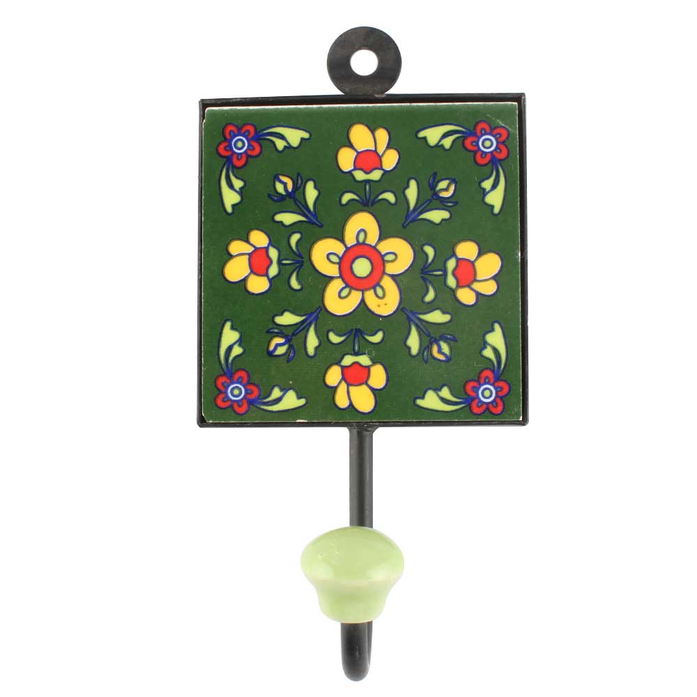 Forest Green Floral Ceramic Tile Hook. When Put on Wall or Cabinet It is An Art in Itself. The Metal Part of this Hook is Black Powder Coated.