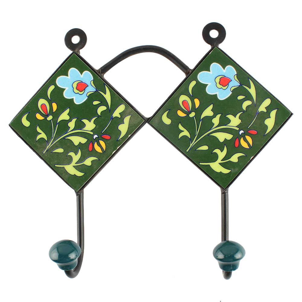 Forest Green Floral Ceramic Tile Hook. When Put on Wall or Cabinet It is An Art in Itself. The Metal Part of this Hook is Black Powder Coated.