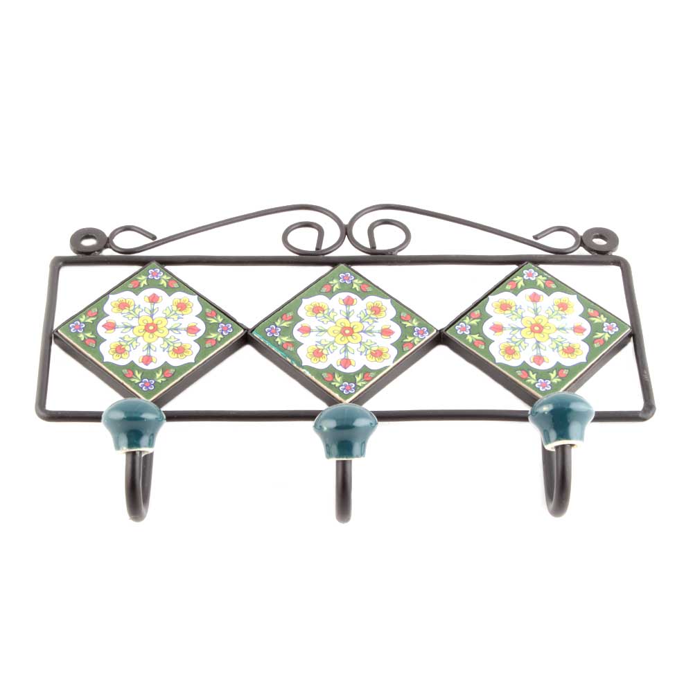 Forest Green White Floral Tiles Hook. When Put on Wall or Cabinet it is an Art in itself. The Metal Part of this Hook is Black Powder Coated.