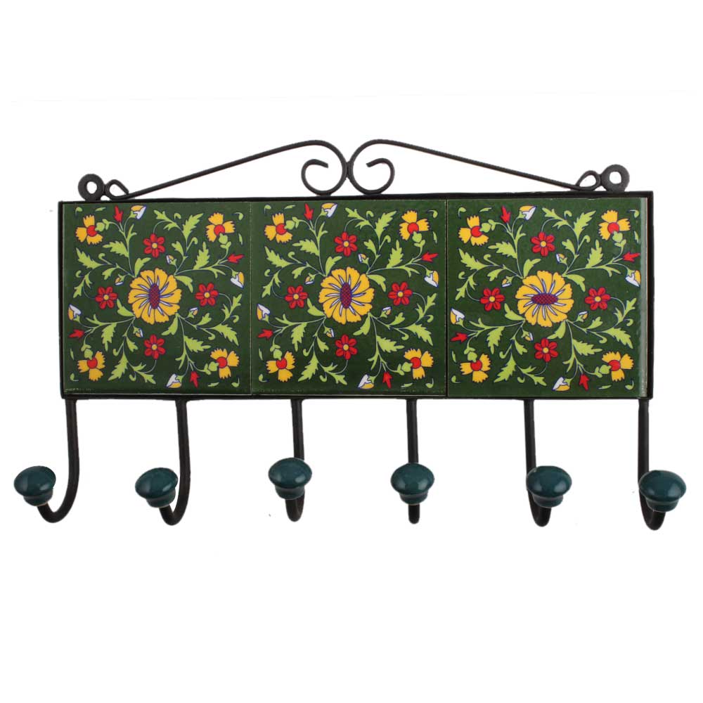 forest Green Yellow Floral Tiles Hook. When Put on Wall or Cabinet It is An Art in Itself. the Metal Part of This Hook is Black Powder Coated.