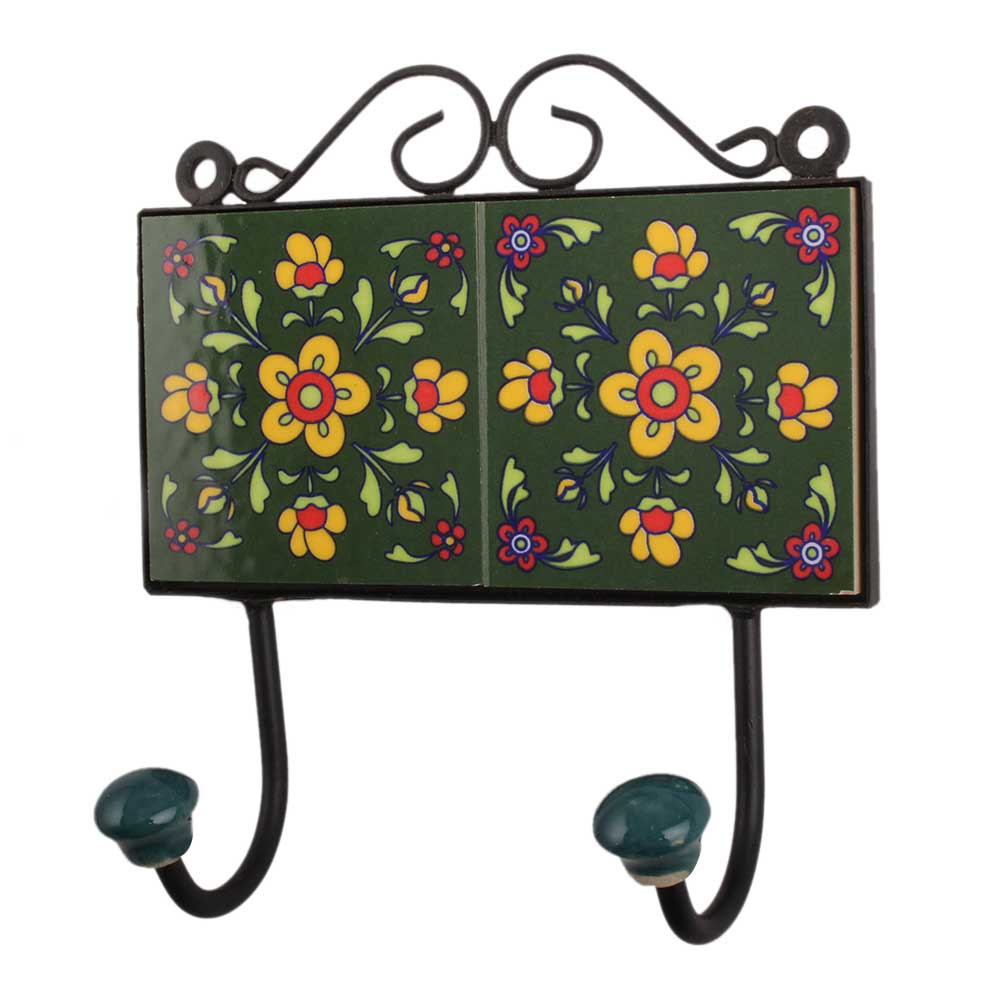 forest Green Yellow Floral Tiles Hook. When Put on Wall or Cabinet It is An Art in Itself. the Metal Part of This Hook is Black Powder Coated.