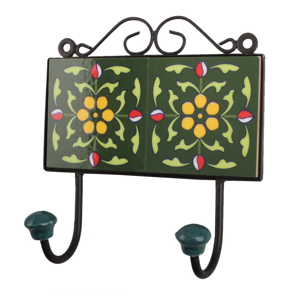 forest Green Yellow Floral Tiles Hook. When Put on Wall or Cabinet It is An Art in Itself. the Metal Part of This Hook is Black Powder Coated.