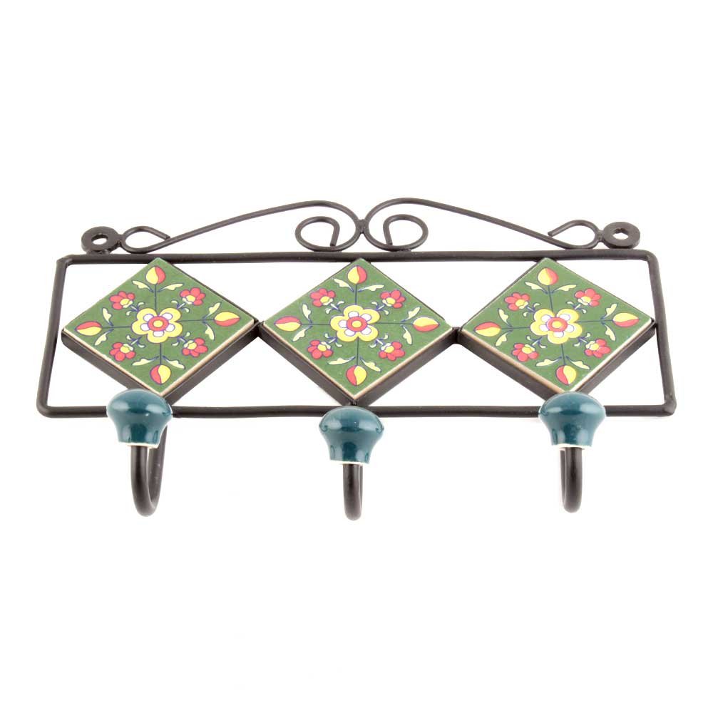 Forest Green Yellow Floral Tiles Hooks. When Put on Wall or Cabinet it is an Art in itself. The Metal Part of this Hook is Black Powder Coated.