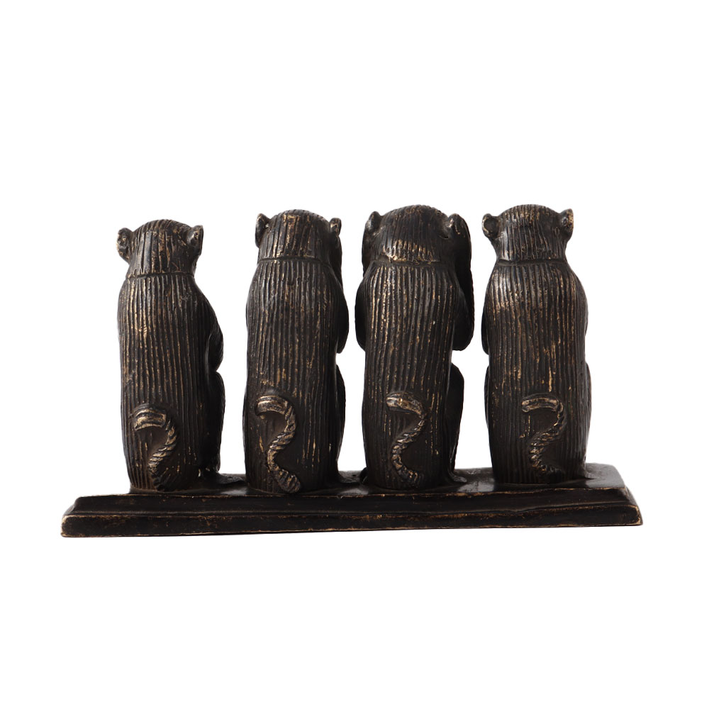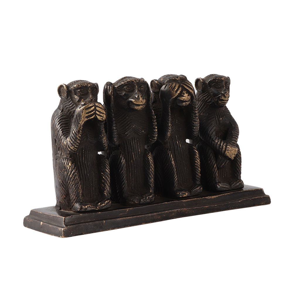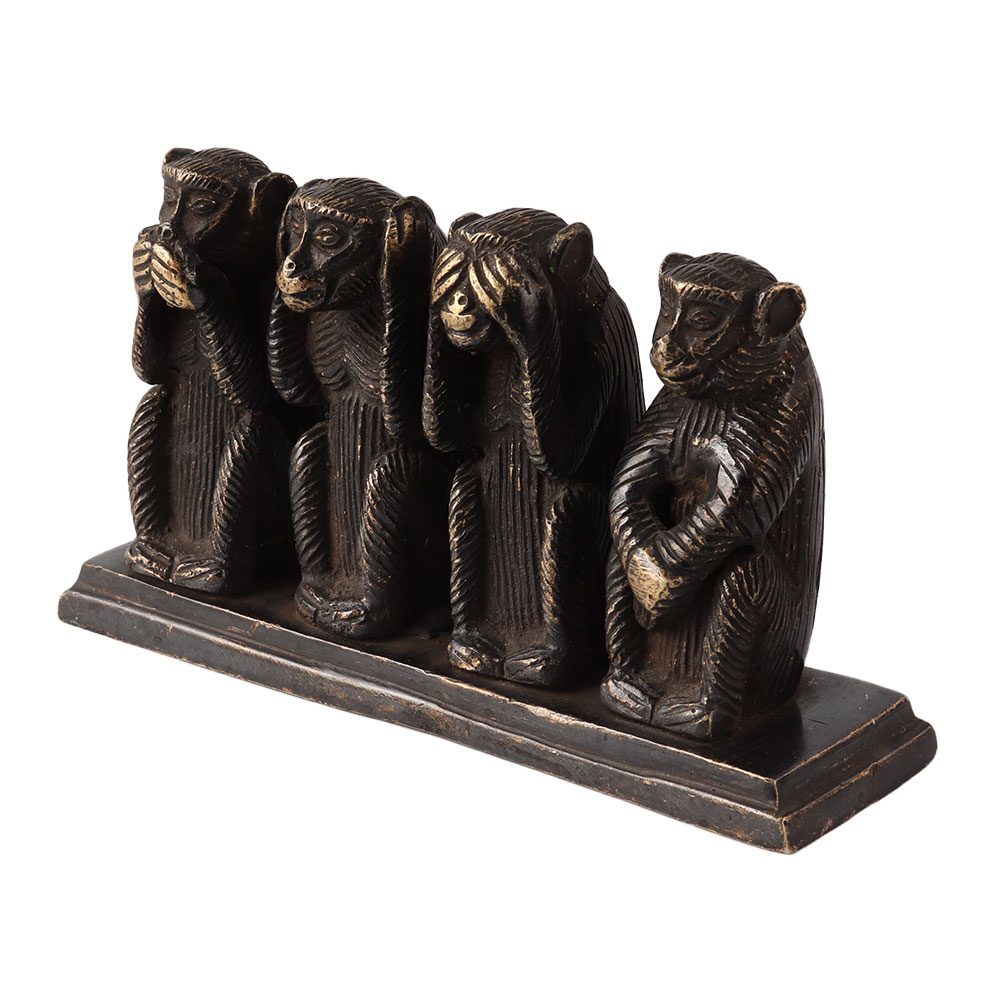 The perfect Retro home decor or good luck charm is a lovely old brass 4 wise Monkeys Hear No Evil See No Evil Speak No Evil Do No. Hear No Evil, See No Evil, and Speak No Evil are represented by the monkeys. Do No Evil is the fourth monkey, who appears to be holding his 'bits.' This is a rarely seen fourth monkey, however he appears to be named Shizaru. It would make a fantastic addition to any collection, display, functional piece, or accurate period prop.