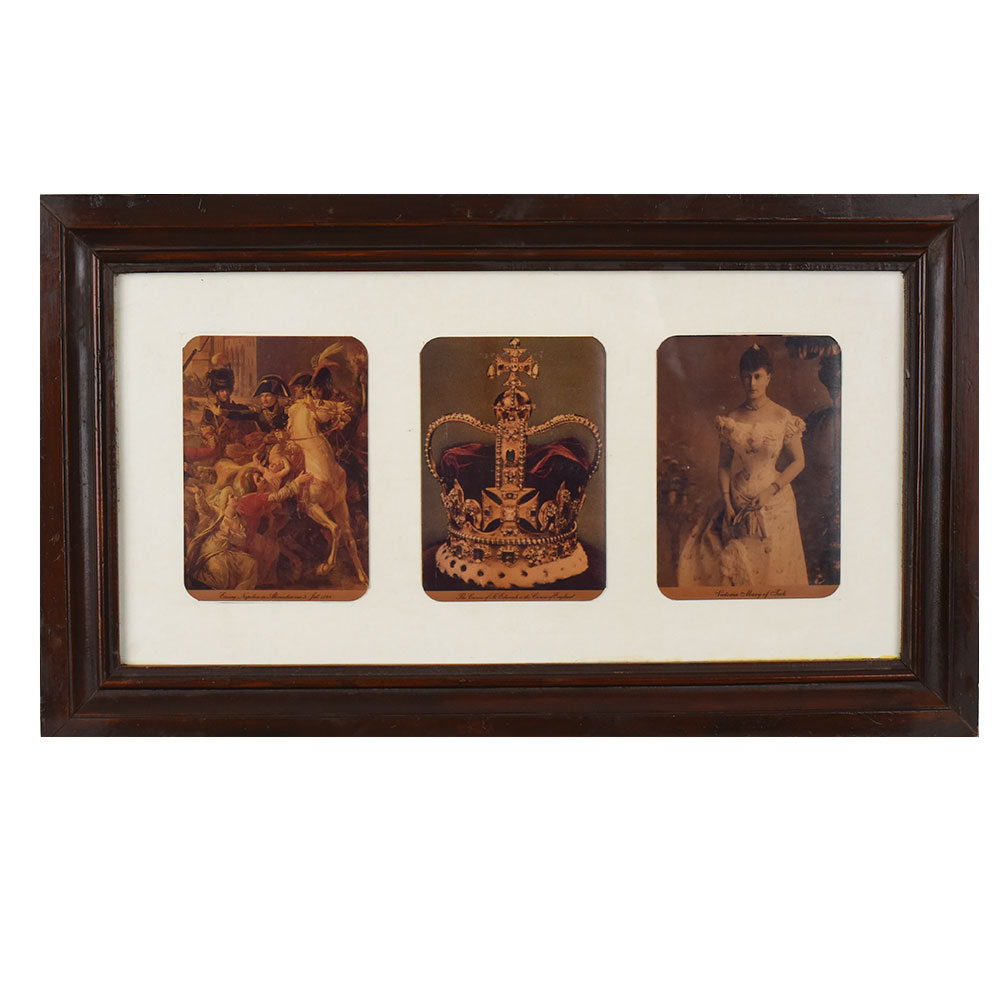This elegant framed set features three vintage paper postcards, each capturing a unique moment of historical and cultural significance. The first postcard depicts an expressive battle scene, portraying the valor and intensity of Napoleon Bonaparte on horseback, surrounded by soldiers and civilians in a dramatic composition. The second postcard showcases the grandeur of the British Crown Jewels, focusing on the majestic crown adorned with precious gems and intricate goldwork, symbolizing royal power and heritage. The third postcard presents a poised portrait of Victoria Mary of Teck, later Queen Mary, dressed in an exquisite gown with delicate embellishments, exuding grace and royal elegance. Each postcard is printed with fine attention to detail, retaining the charm of early photographic and lithographic printing techniques. The warm sepia and rich tones evoke a sense of nostalgia, making this piece a perfect collectible for history enthusiasts, art lovers, or admirers of royal memorabilia. The postcards are neatly mounted within a cream mat and encased in a dark wooden frame, adding sophistication and ensuring preservation. This framed composition serves as both a decorative artwork and a historical keepsake, ideal for display in studies, living rooms, or heritage-themed interiors.