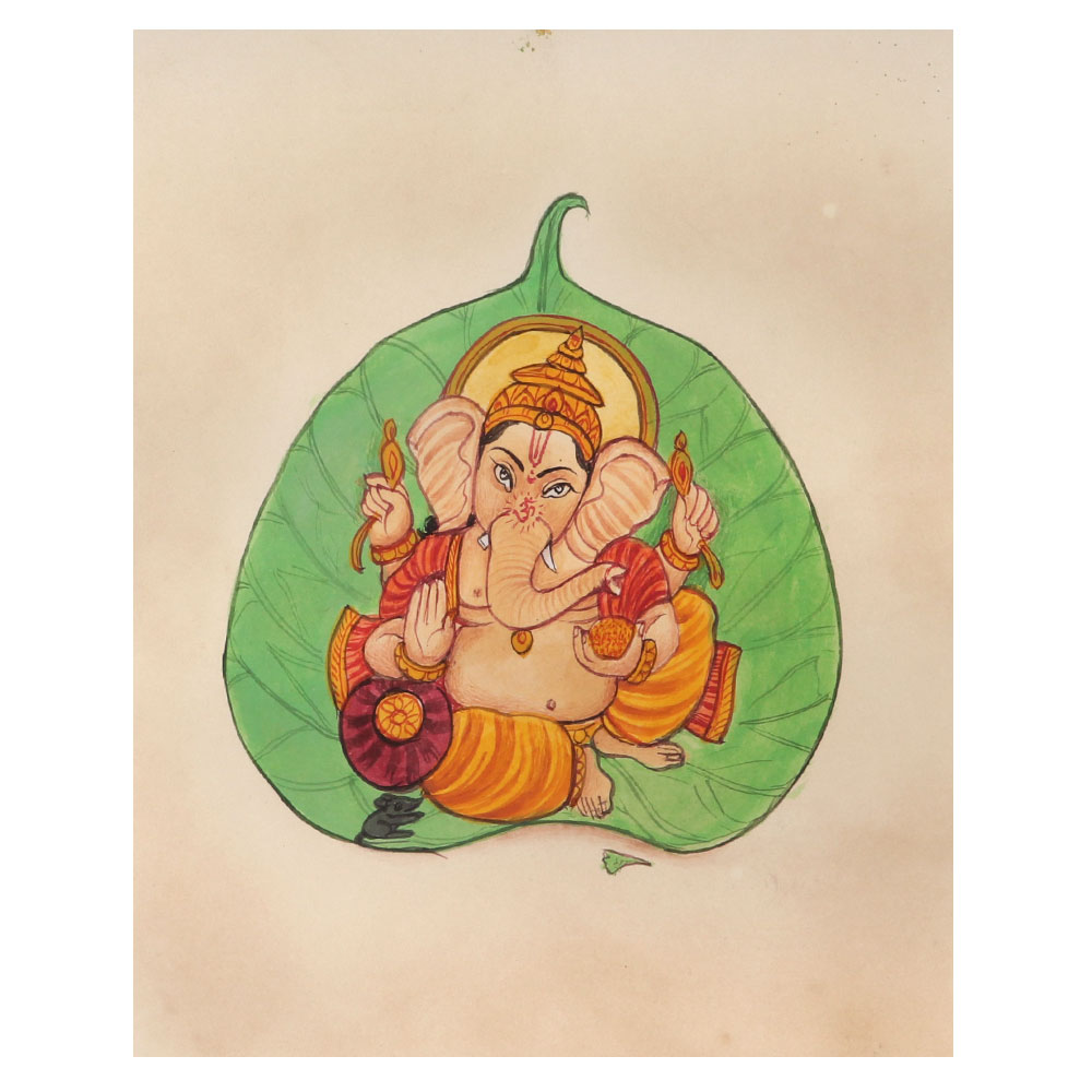 Ganesha On Peepal Leaf Paper Painting of one of the most revered gods in the Hindu pantheon is Ganesha, often known as the God with the Elephant Head. Offerings to Ganesha must be made before beginning any worship or job. Before beginning any activity or endeavour, Ganesha must be prayed to because he is recognised for removing all barriers. Ganesha is shown in this painting in the form that all Hindus are most accustomed to seeing him in.