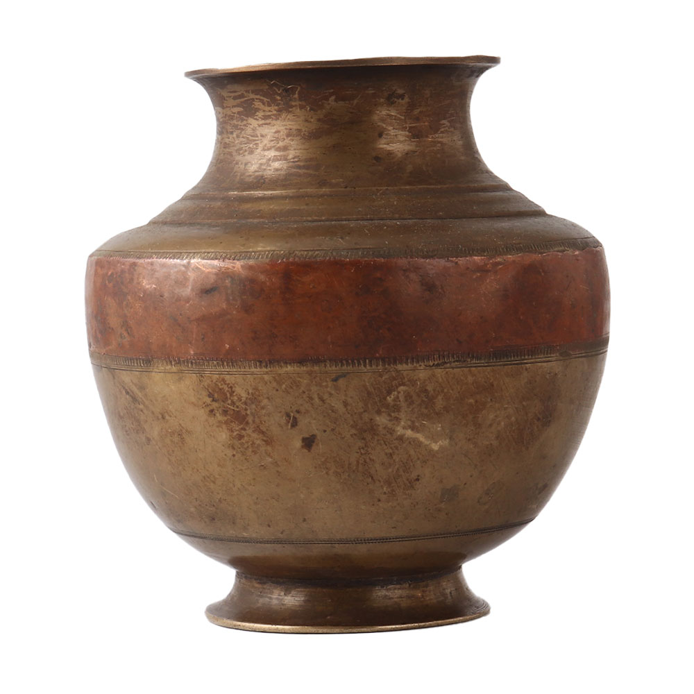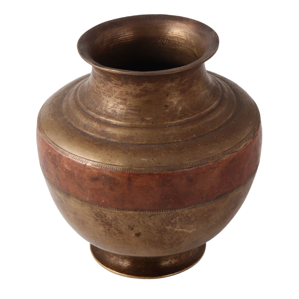 Brass and copper Ganga Jamuna The Holy Water Pot Kalash is a superb conversation piece manufactured with copper and brass combined utilising the ancient Ganga Jamuna Methodology by local artists using traditional tools and methods. Pooja gift, temple decoration, wedding gift, stage decoration for close friends and family.