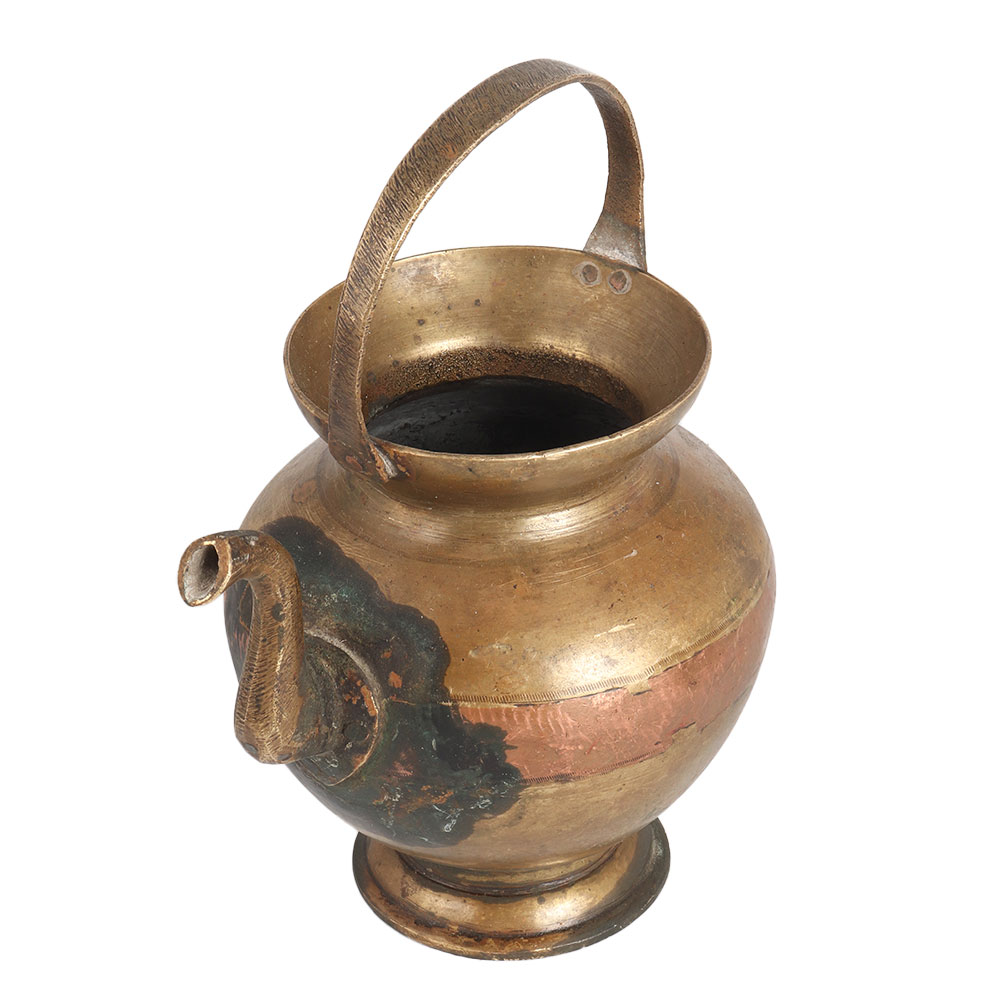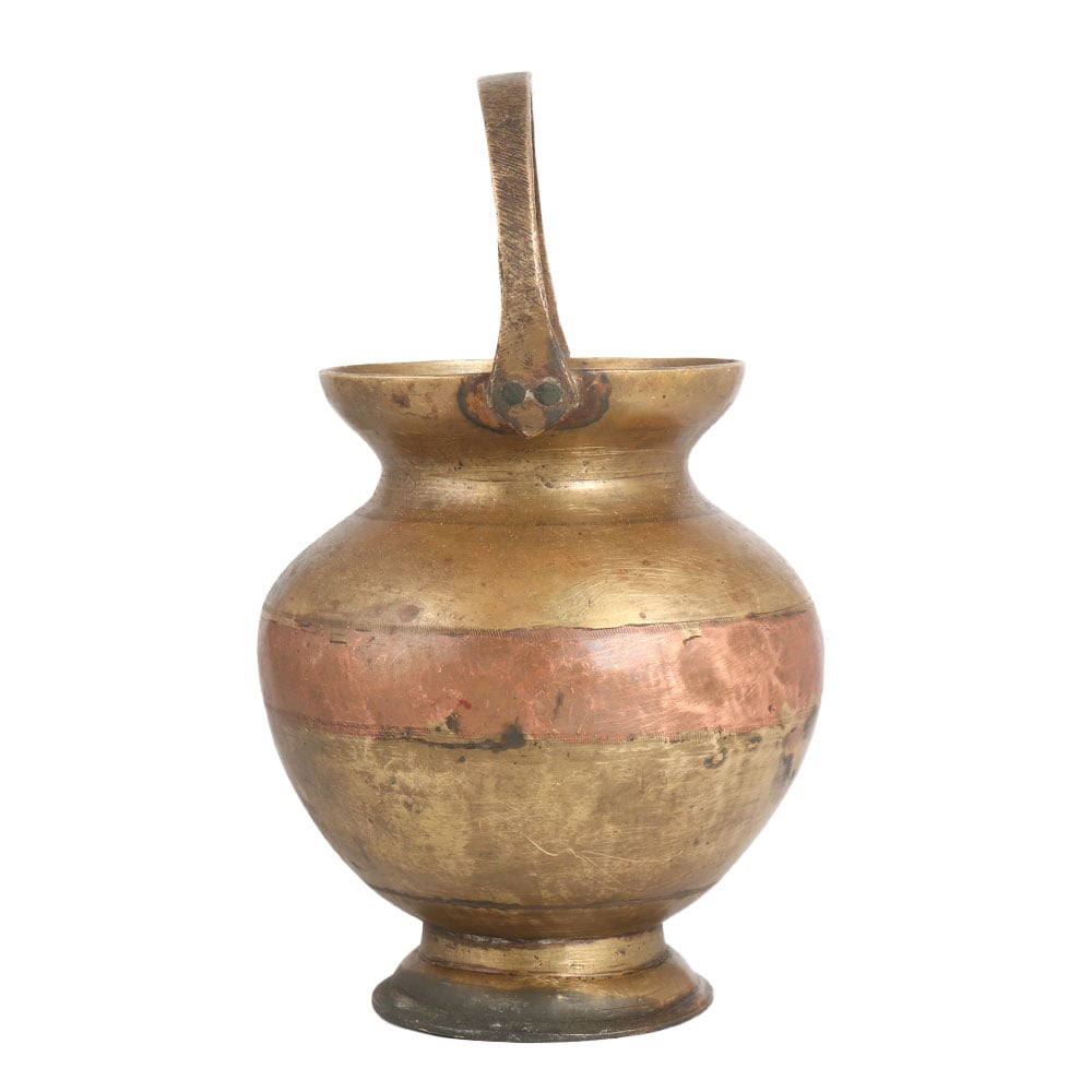 A brass water pot or kamandal with copper engraving in the center. It is made by skilled Indian artisans with their hands using ancient methods. Brass and copper water pots are known as Ganga Jamuna water pot. This kamandal has a narrow spout to offer water to devotees at the temple and auspicious occasions, and a handle for better grip. Place this sturdy pot on the table, shelf, reception counter or bill counter to add a charming look to the interior. This vintage Kamandal pot is a best seller these days as it reminds us of our rich heritage. A gift for any special and festive occasion for your family, friends and relatives.