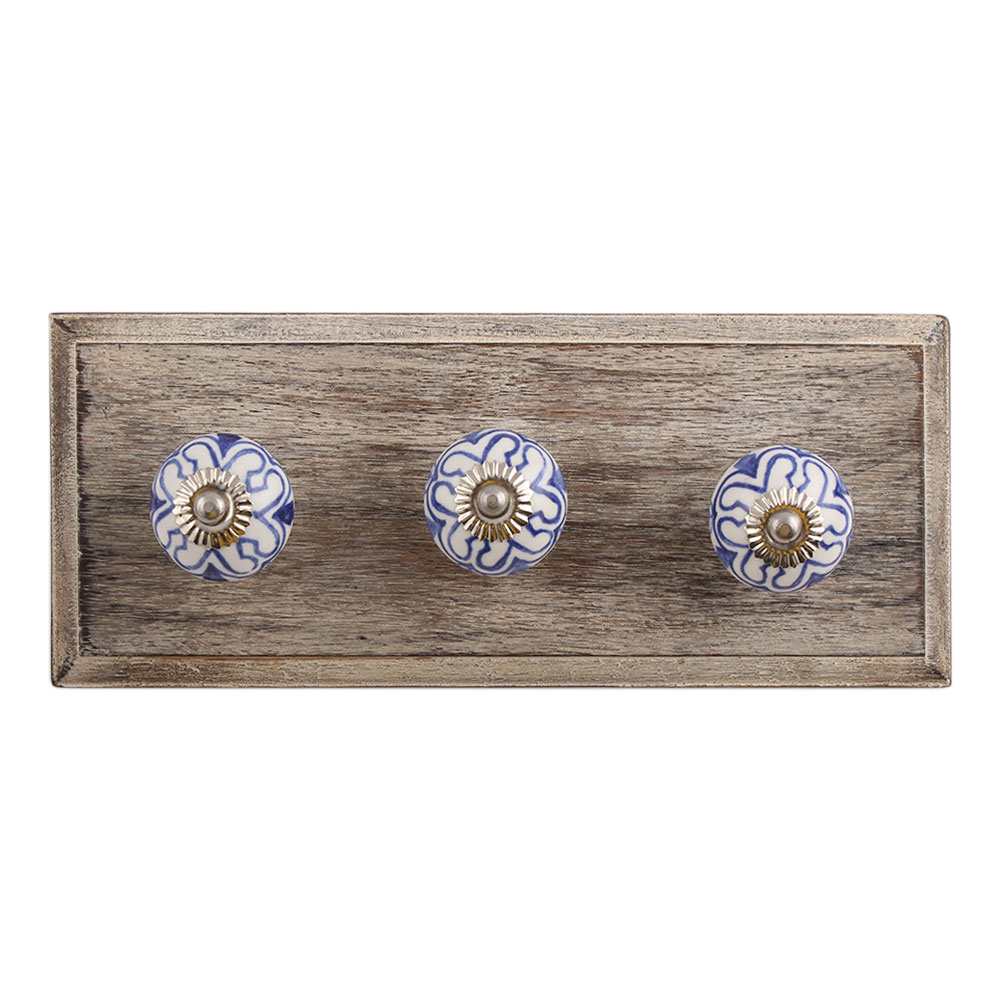 Geoffrey Blue Ceramic Wooden Hook. A Perfect Complement to the Soft Tone of the Wood are these White Traditional Hat & Coat Hook Made of Genuine Porcelain and Brass. It can be use to Hang Jewellery, Leashes, Towels, Scarves, Light Weight Sweaters, Caps Etc.