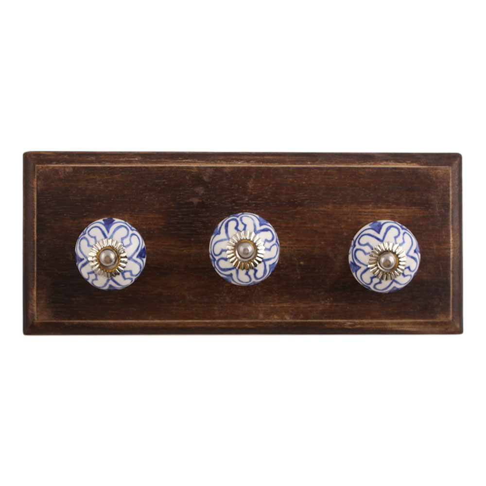 Geoffrey Blue Ceramic Wooden Hook. A Perfect Complement to the Soft Tone of the Wood are these White Traditional Hat & Coat Hook Made of Genuine Porcelain and Brass. It can be use to Hang Jewellery, Leashes, Towels, Scarves, Light Weight Sweaters, Caps Etc.
