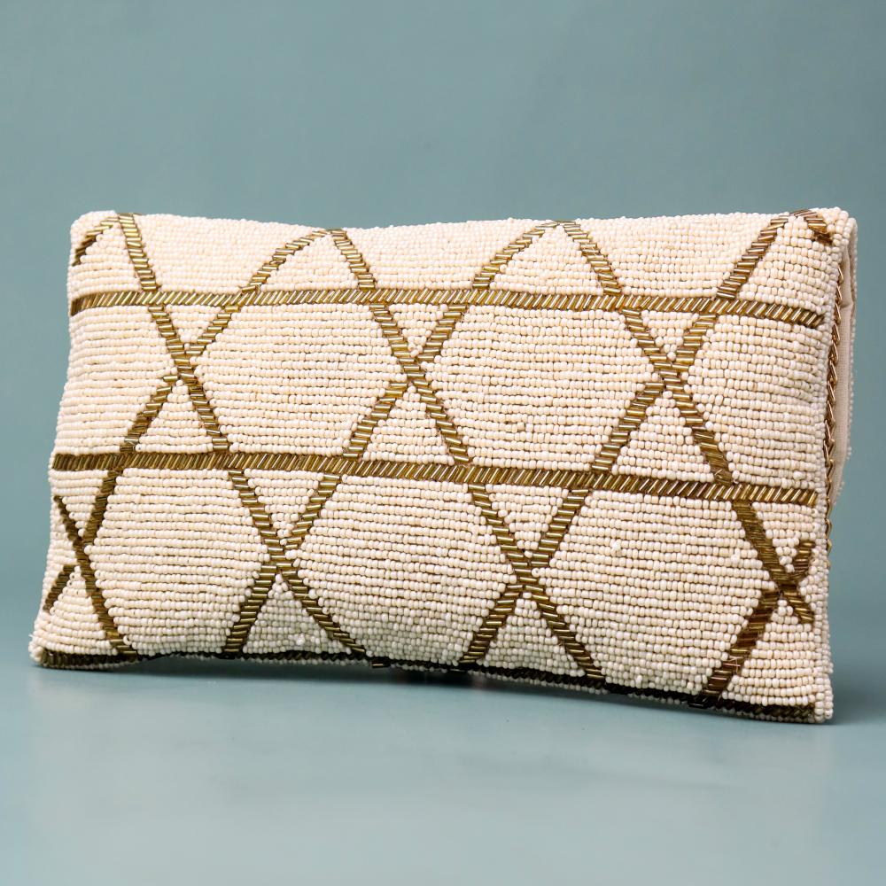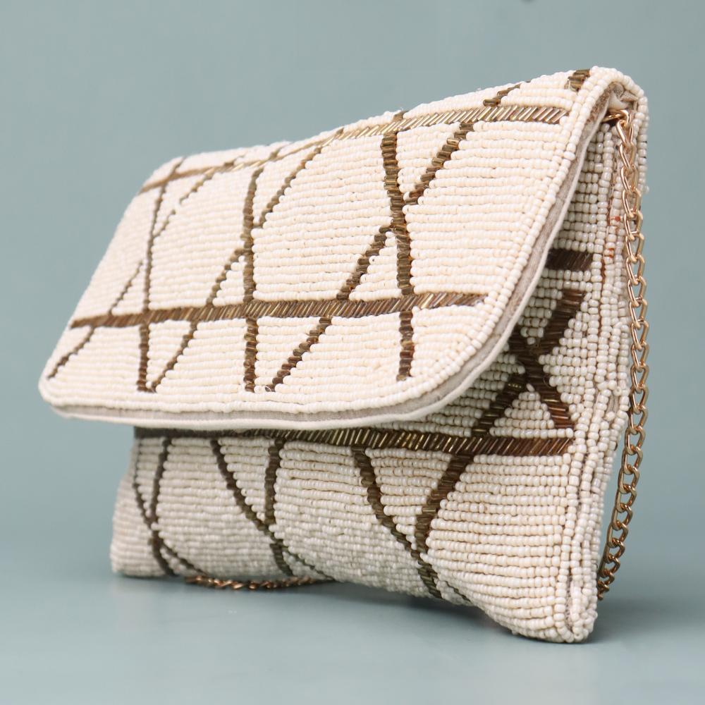 Geometric Grace Hand-Beaded Clutch with Elegant Chain Strap