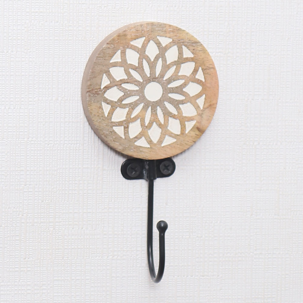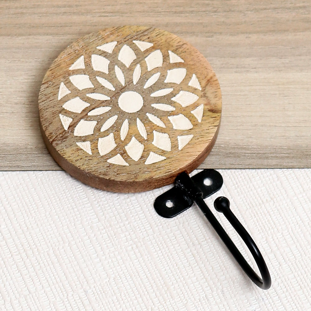 Material: Solid wood with sturdy iron hook Finish: Rich brown stain with hand-carved geometric pattern Installation: Screw-mounted with pre-drilled holes