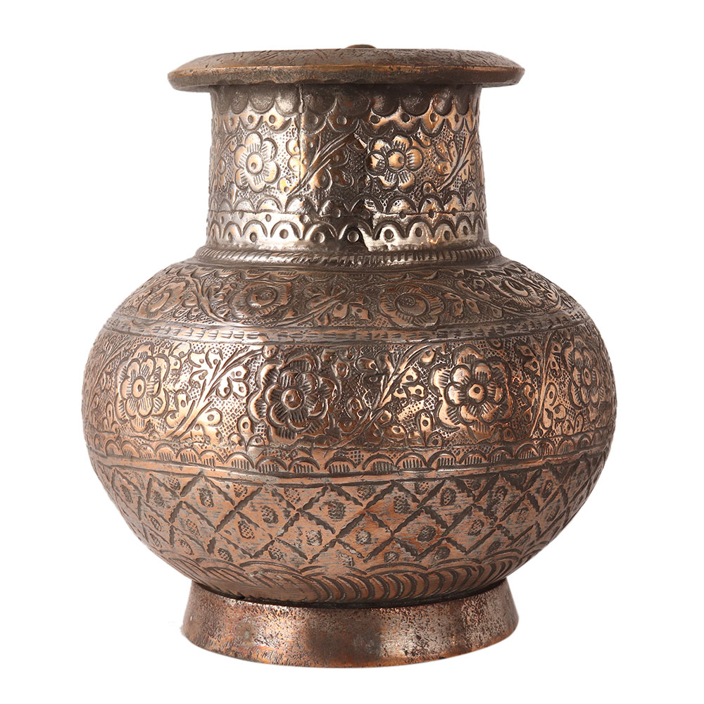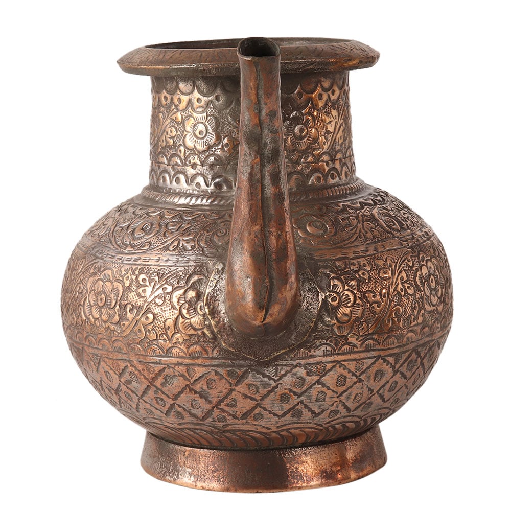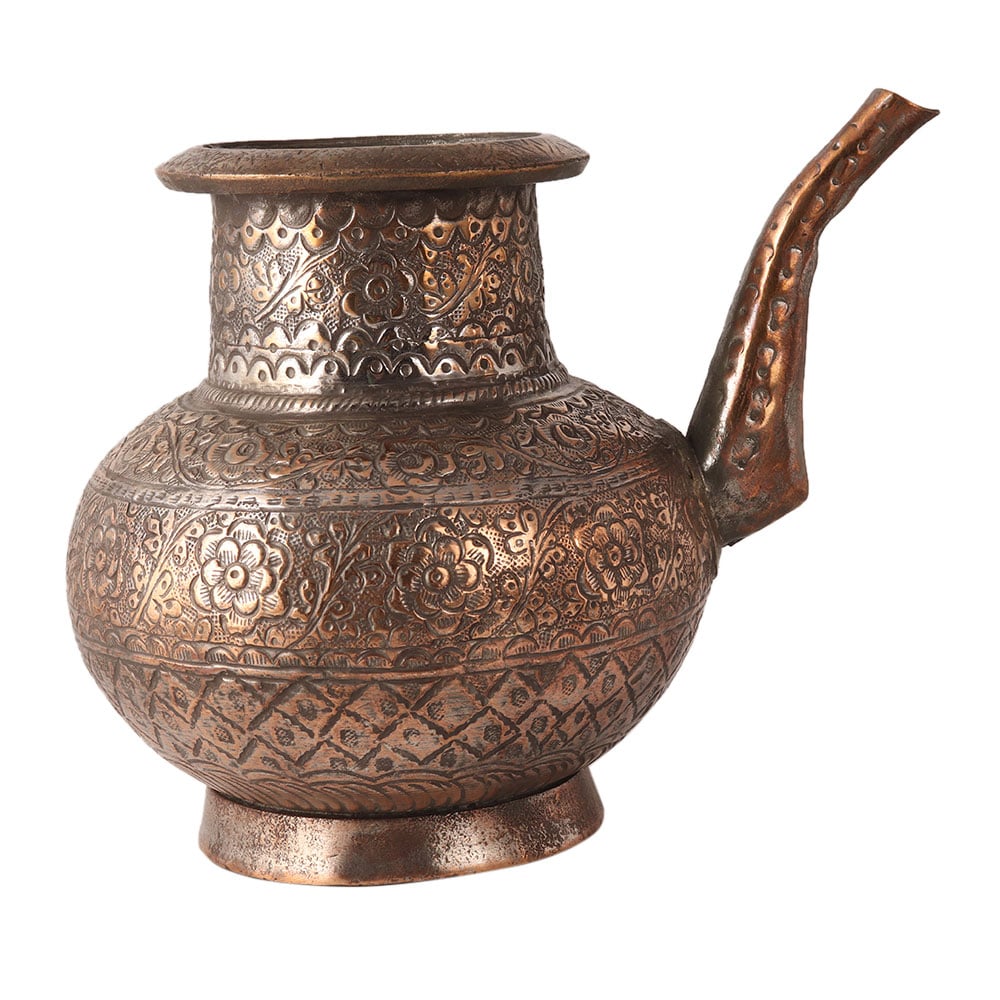 Glamorous holy water pot with hand engraved floral patterns by skilled craftsmen from India. It is made of copper. Your collection is incomplete with this pot.