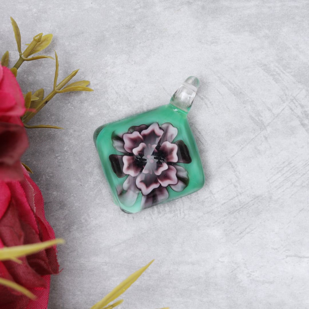 The Lampwork Flower Engraved Green Diamond Glass Pendant is a stunning piece of handmade jewelry that combines the brilliance of green glass with delicate floral engraving. This pendant offers a unique blend of vibrant color and intricate craftsmanship, making it an eye-catching addition to any necklace or jewelry collection. Its diamond-like cut ensures that it catches and reflects light beautifully, adding an element of sparkle to your ensemble.