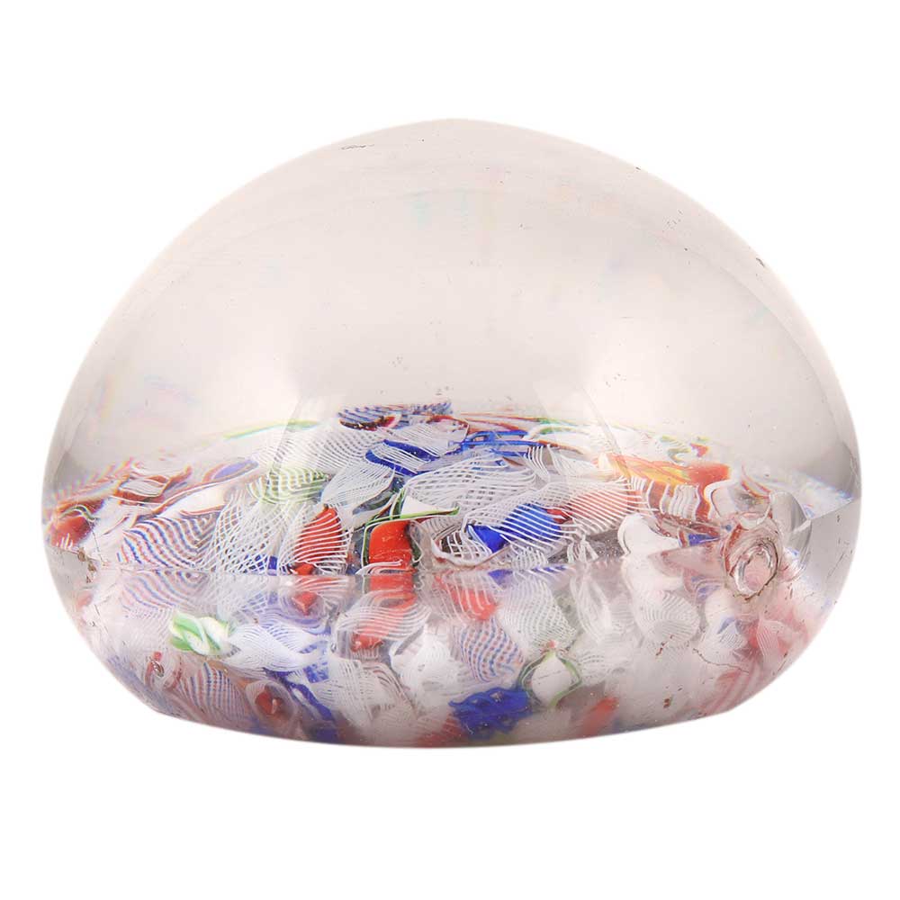 This weighty but delicate glass paperweight is filled with vibrant colours, making it an ideal complement to any workstation. Excellent for a desk, side table, or counter top.