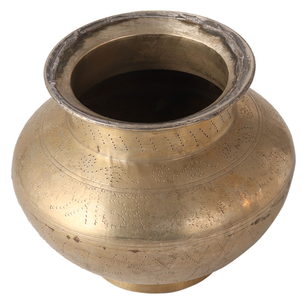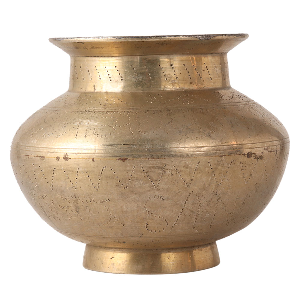 This golssy brass pot was used in Hindu wedding ceremonies to keep rice in. It was tied with moli (red string) at the neck, with mango leaves on top and a coconut placed on top of the leaves. It is an ideal item for the reception.