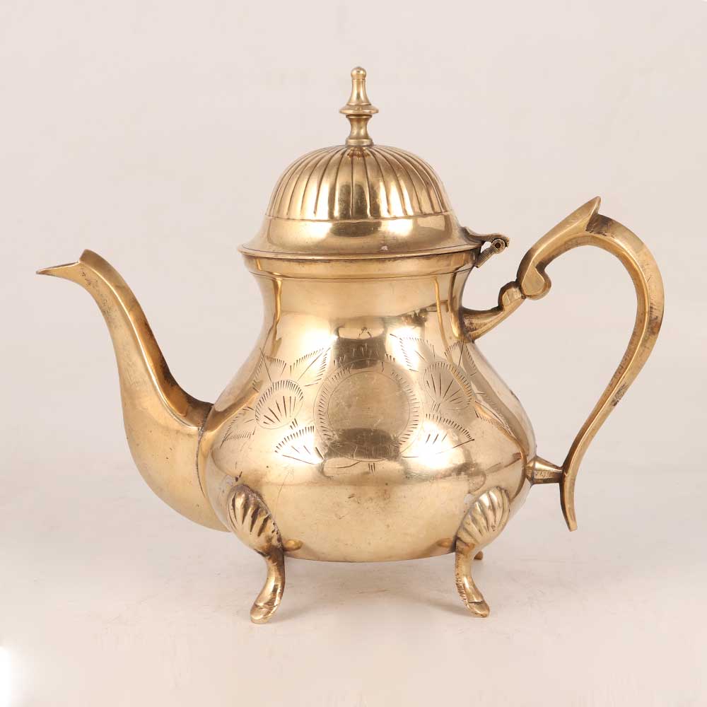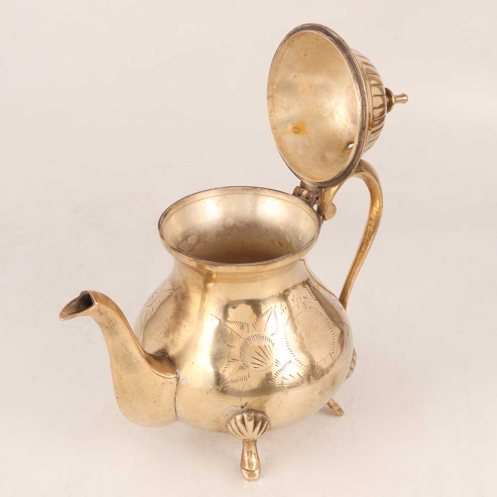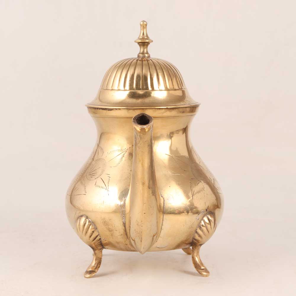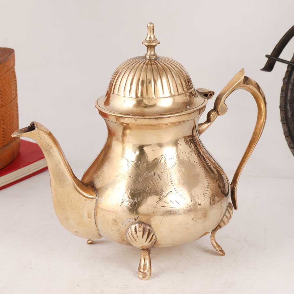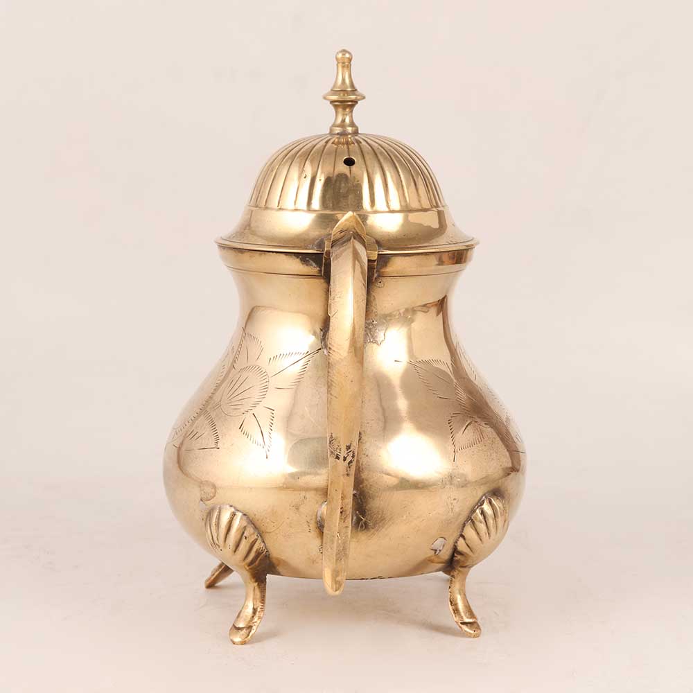Transport yourself back to an era of elegance with this exquisite vintage brass kettle, a true testament to timeless craftsmanship and aesthetic allure. This ornate piece is adorned with intricate engravings that showcase the mastery of talented artisans from the renowned English Art tradition. Crafted from high-quality brass with a lustrous golden finish, this kettle exudes opulence and sophistication, instantly capturing the eye and adding an air of refinement to any space. Its striking lid and elegantly shaped spout reflect the meticulous attention to detail, while four sturdy legs provide a stable base when placed on any surface. While originally used for keeping tea, its vintage charm is now better suited for decorative purposes rather than cooking. Ideal for home, office, restaurant, hotel, or café settings, it infuses spaces with a sense of old-world charm and nostalgia. Whether displayed at exhibitions or added to a vintage collection, this brass kettle is a collector's dream. More than just a decorative piece, it also makes for a thoughtful gift to cherish special moments. Present it to your loved ones on auspicious occasions, festive celebrations, or milestone events, symbolizing the beauty of enduring craftsmanship and the warmth of timeless memories.