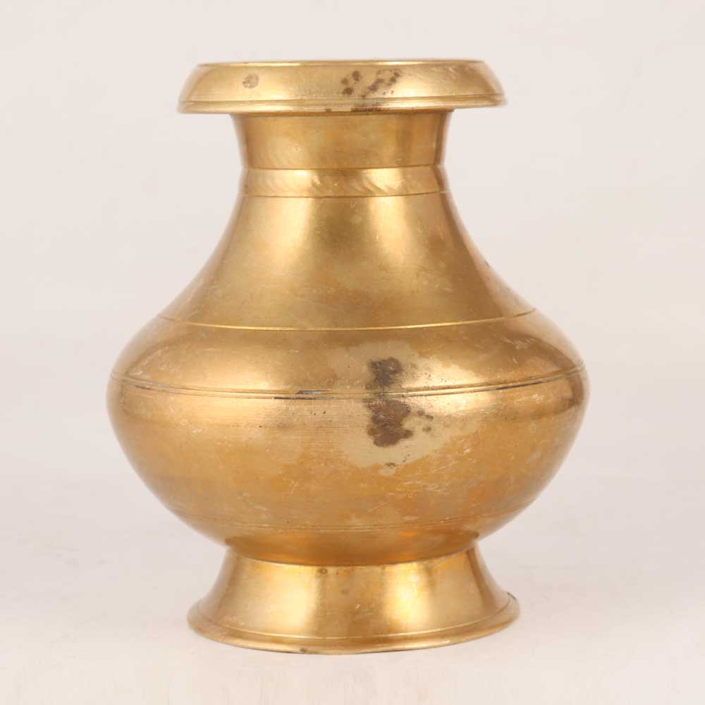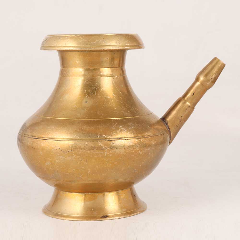 This brass holy water pot with a delicately crafted spout is a masterpiece of artistry and devotion. Skillfully handmade by talented Indian artisans, this exquisite piece is crafted with meticulous attention to detail, using high-quality brass for a lustrous and antique golden finish that exudes elegance and grandeur. Versatile in its application, this holy water pot finds a cherished place in any setting, be it your home, office, restaurant, hotel, or cafe. Its presence instantly elevates the ambiance, adding a touch of sacred beauty to any space. At exhibitions, it becomes a captivating focal point, impressing visitors with its intricate design and cultural significance. Embracing a deep-rooted tradition, this brass water pot is not only a decorative item but also a medium for offering blessings to devotees. Pouring water from the elegantly crafted spout symbolizes bestowing spiritual purification and good fortune upon the faithful. Moreover, this divine creation serves as a thoughtful and heartfelt gift for your loved ones on special, festive, or auspicious occasions. By presenting them with this sacred treasure, you impart your warm wishes and share the essence of spirituality and artistry.