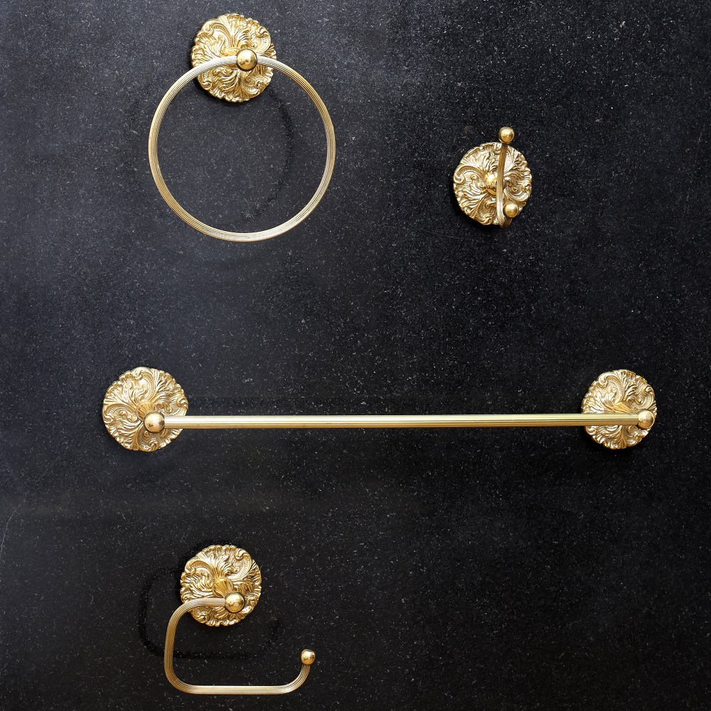 Elevate Your Bathroom with Elegant Brass Hardware. This exquisite 4 piece brass bathroom hardware set brings timeless sophistication to any bathroom. Crafted from solid brass with a brilliant golden finish, each piece is built to last for decades. The elegant designs add a touch of luxury without being overly ornate, blending perfectly into traditional and modern decor alike. With its durability and effortless style, this bathroom hardware set is ideal for discerning homeowners who appreciate fine details. The golden brass finish warms up sterile bathrooms and complements natural materials like stone and wood. Mounting hardware is included for easy DIY installation. Make your morning and evening routines feel indulgent with beautiful brass hardware that elevates your space. This set makes a meaningful upgrade that you and your guests will enjoy for years to come. The set includes: