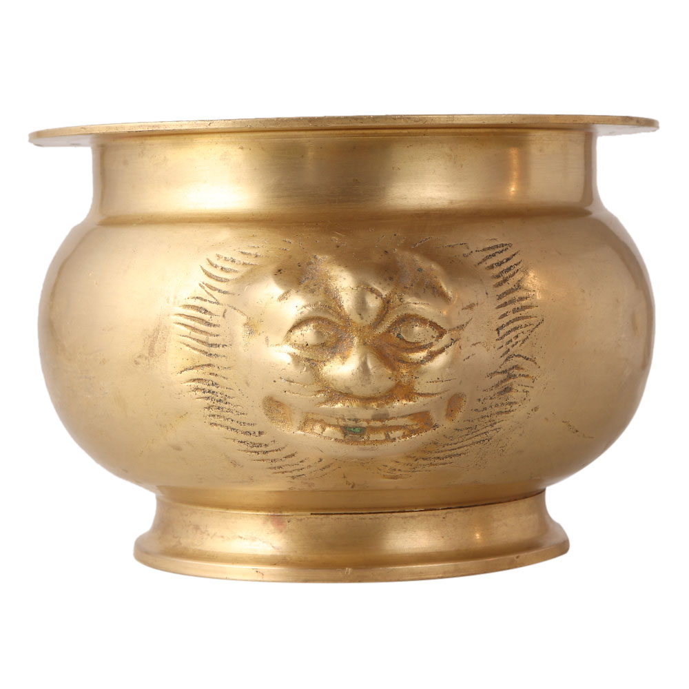 This water pot or Lota is made of brass. It has a smooth surface with shiny golden colour and a stand on the bottom to keep it on the surface. It is carved with two lions in Chinese art on the sides opposite to each other. For centuries it has been used in Hindu rituals, havans and in offering water to the sun. In temples, Lota is used to pour water on the Shivling, it absorbs the negative energy from the environment and spreads positive energy. An attractive piece of art for your vintage collection.
