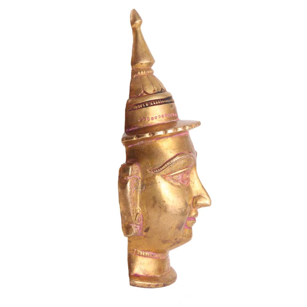 Shiva is portrayed as a warrior on this grand and exquisite solid brass mask. It is most likely from the late nineteenth century, though it could be older. A third eye on the forehead, huge almond eyes, a prominent nose, and a fine moustache are all notable aspects of the figure's expressive face. The lips are thin but protrude outward. Fantastic present for treasured relatives and friends.