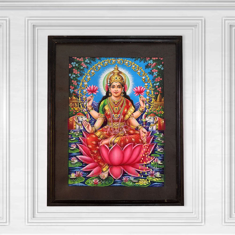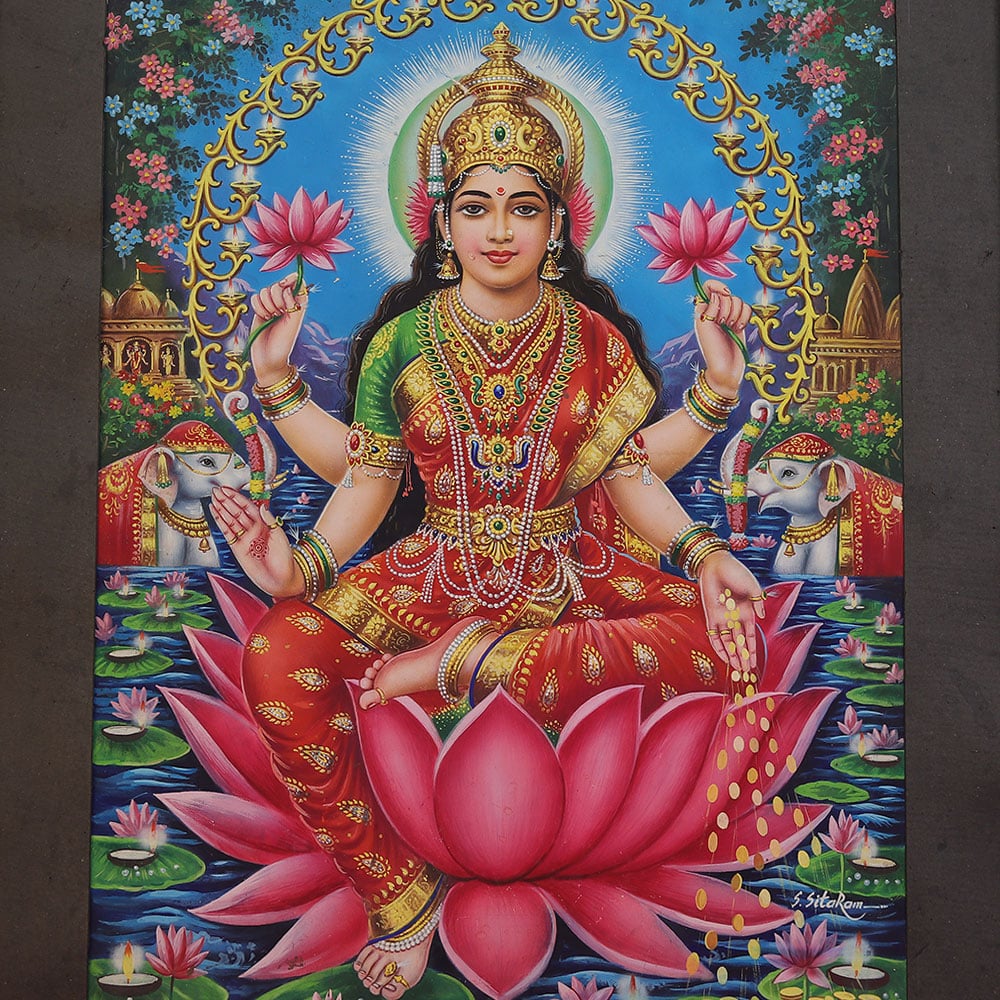 - Vibrant, intricate depiction of the goddess Laxmi within a large colander