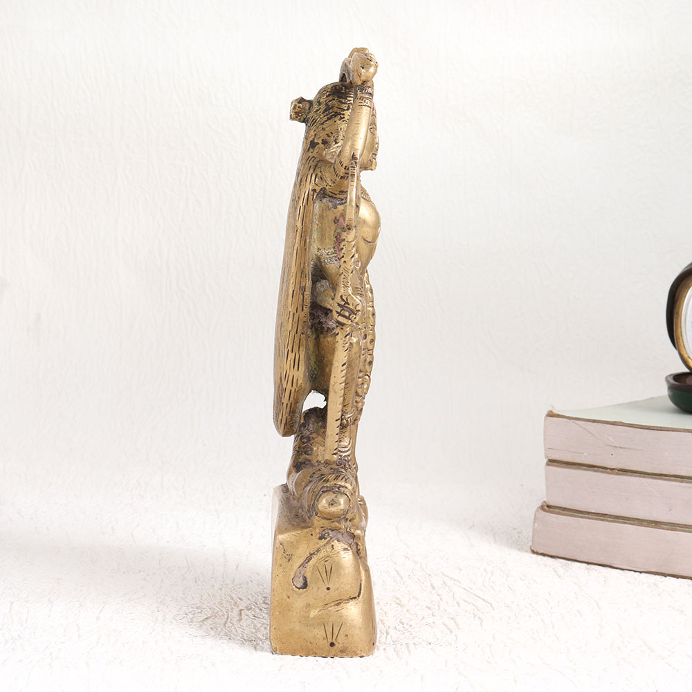 Buy a Brass Statue of Goddess Maa Kaali standing atop Lord Shiva in an exquisite antique brown finish. Crafted with meticulous care and devotion by highly skilled and experienced Indian artisans, this statue embodies the rich cultural heritage of India. The sculpture showcases the fierce yet benevolent Goddess Kaali, an epitome of power and devotion standing gracefully upon her consort, Lord Shiva. Cast from high-quality brass, this piece exudes timeless elegance and durability, ensuring it will be cherished for generations to come. Versatile in its utility, this sacred statue is a perfect addition to your home, office, restaurant, hotel, cafe, or shop. Its presence can inspire worship, create an aura of serenity, or simply enhance the aesthetic appeal of any space. Whether you're an avid collector of vintage treasures or curating an exhibition, this artefact deserves a place of honour. It also makes for a thoughtful and meaningful gift, perfect for celebrating special, festive, or auspicious occasions with loved ones.