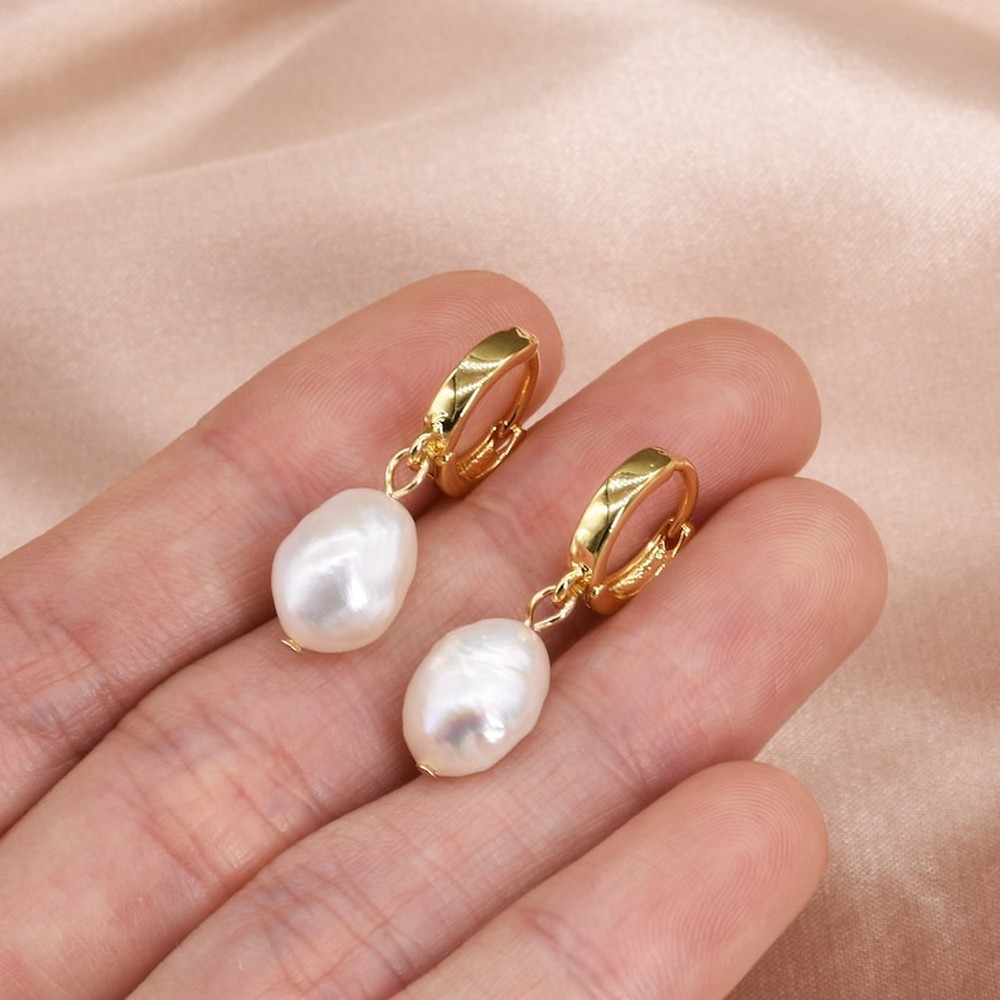 • Gold Huggie Hoops with Baroque Pearl Drops