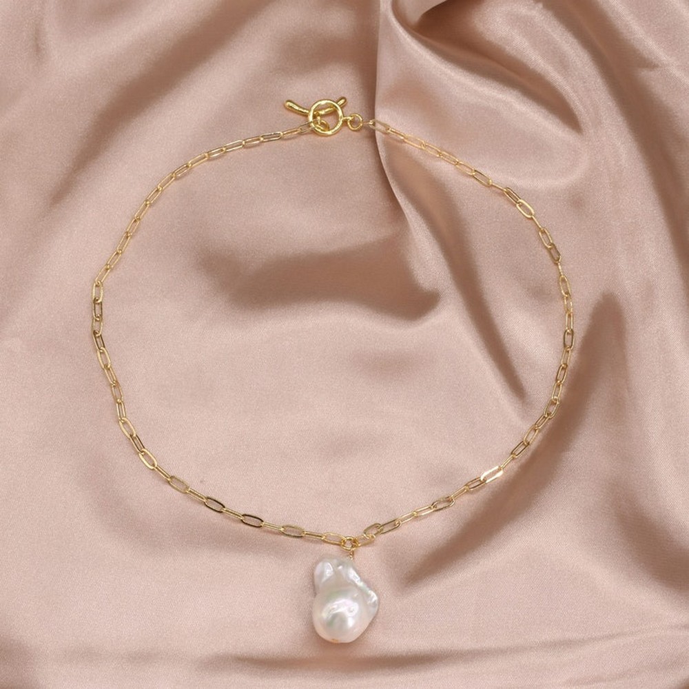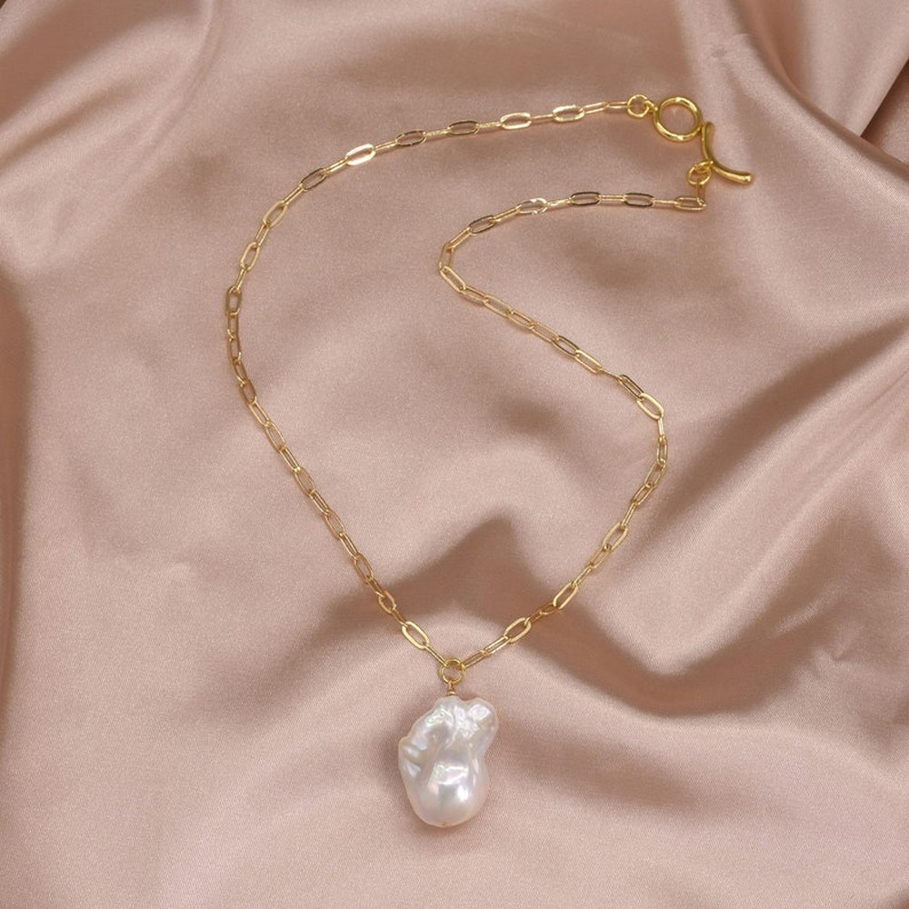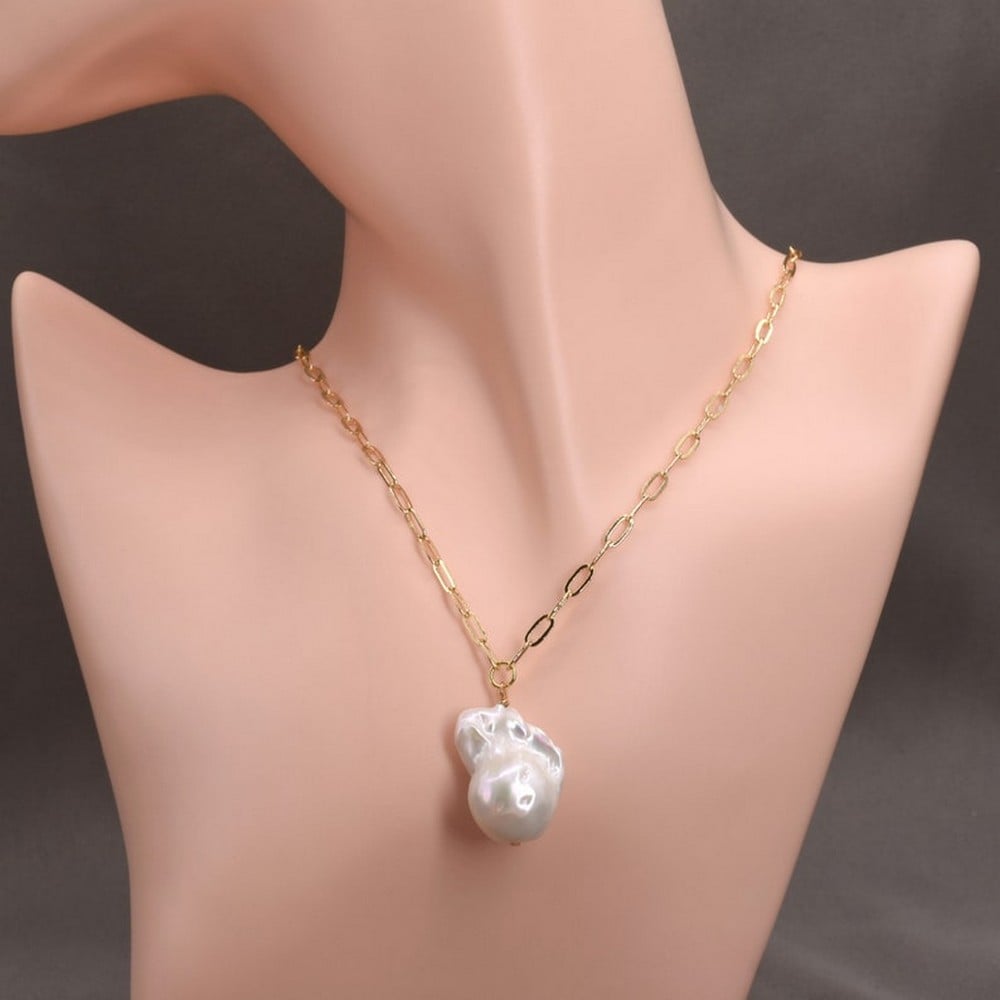 Bold, organic, and beautifully radiantour gold plated chain necklace with a large baroque pearl pendant is a statement piece designed to elevate any wardrobe. Featuring a naturally formed fireball-style pearl suspended from a sleek gold chain, this necklace blends contemporary elegance with timeless organic beauty.