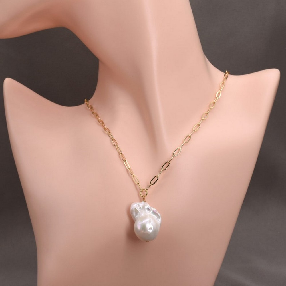• Design: Modern long-link chain with a large sculptural pearl pendant