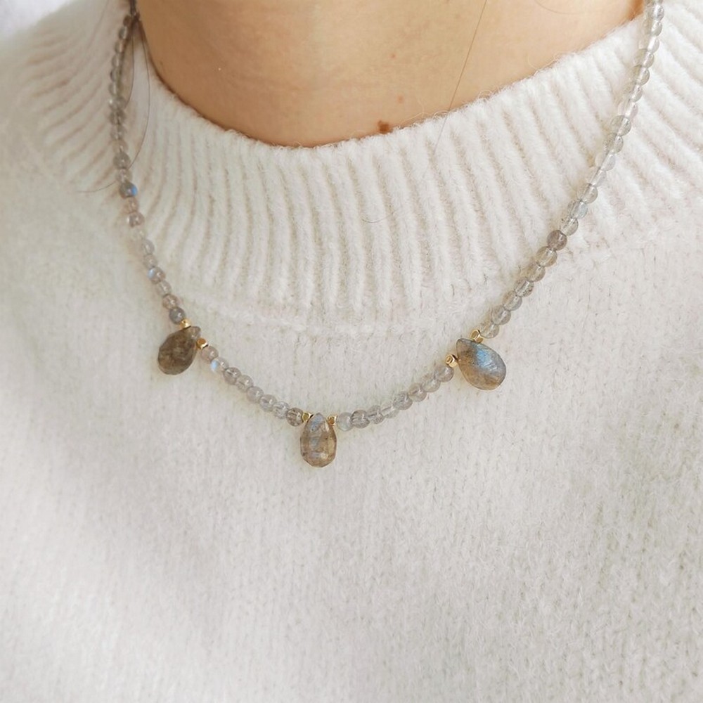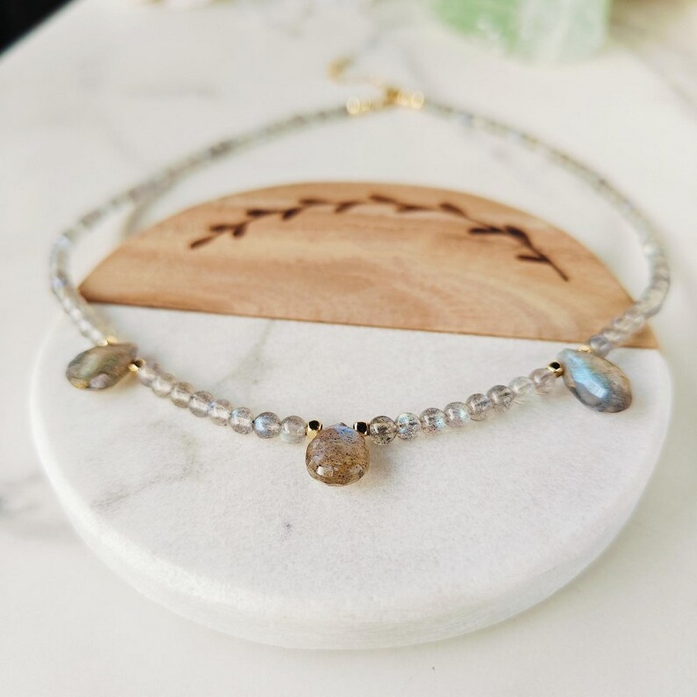 Style this labradorite and crystal necklace with neutral or monochrome outfits to highlight the gemstone’s color play, and store it in a soft jewelry pouch to preserve the plating.