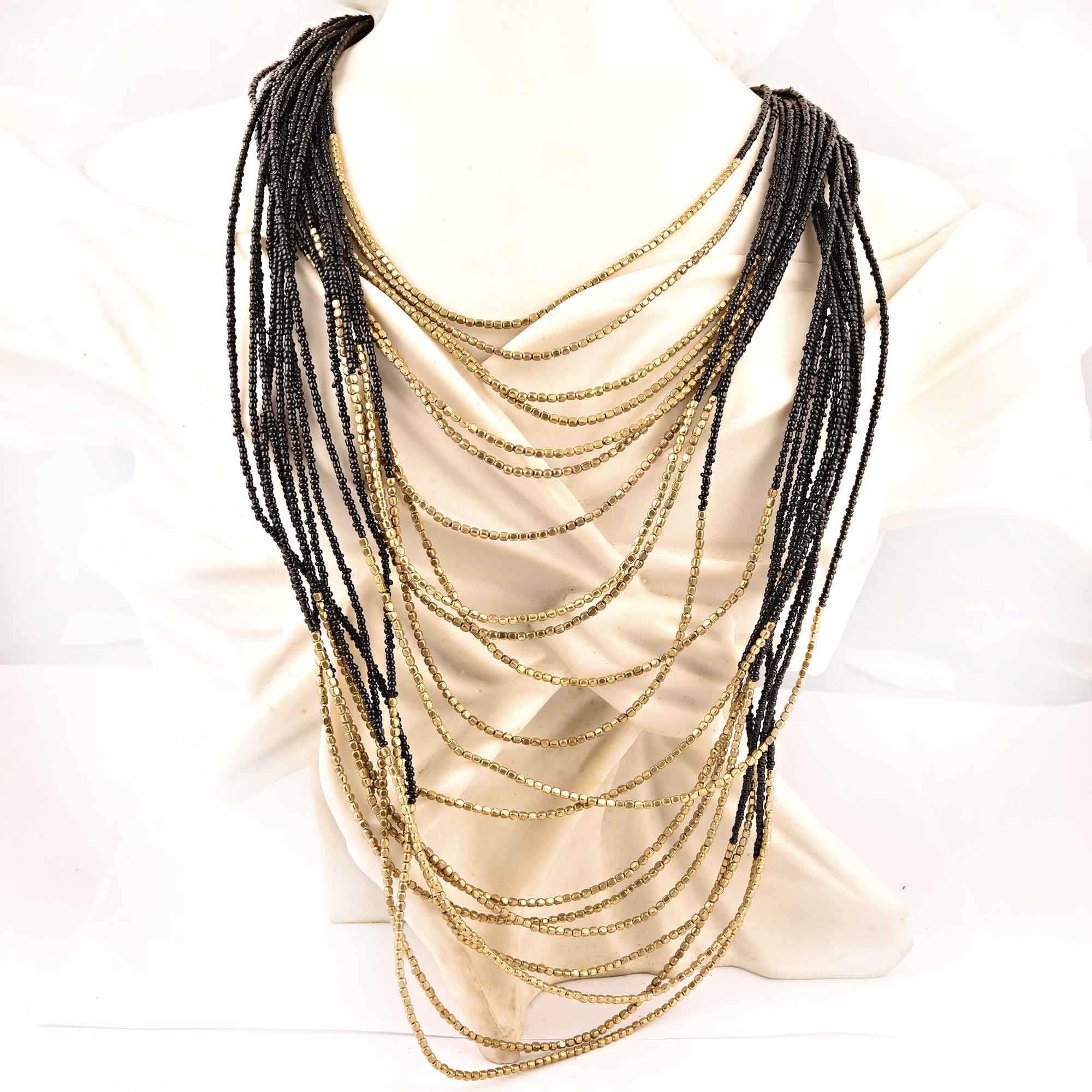 Golden Black Layered Necklace New Beautiful Jewellery. Seed Beads, Cotton With Brass Chain and Clasp.