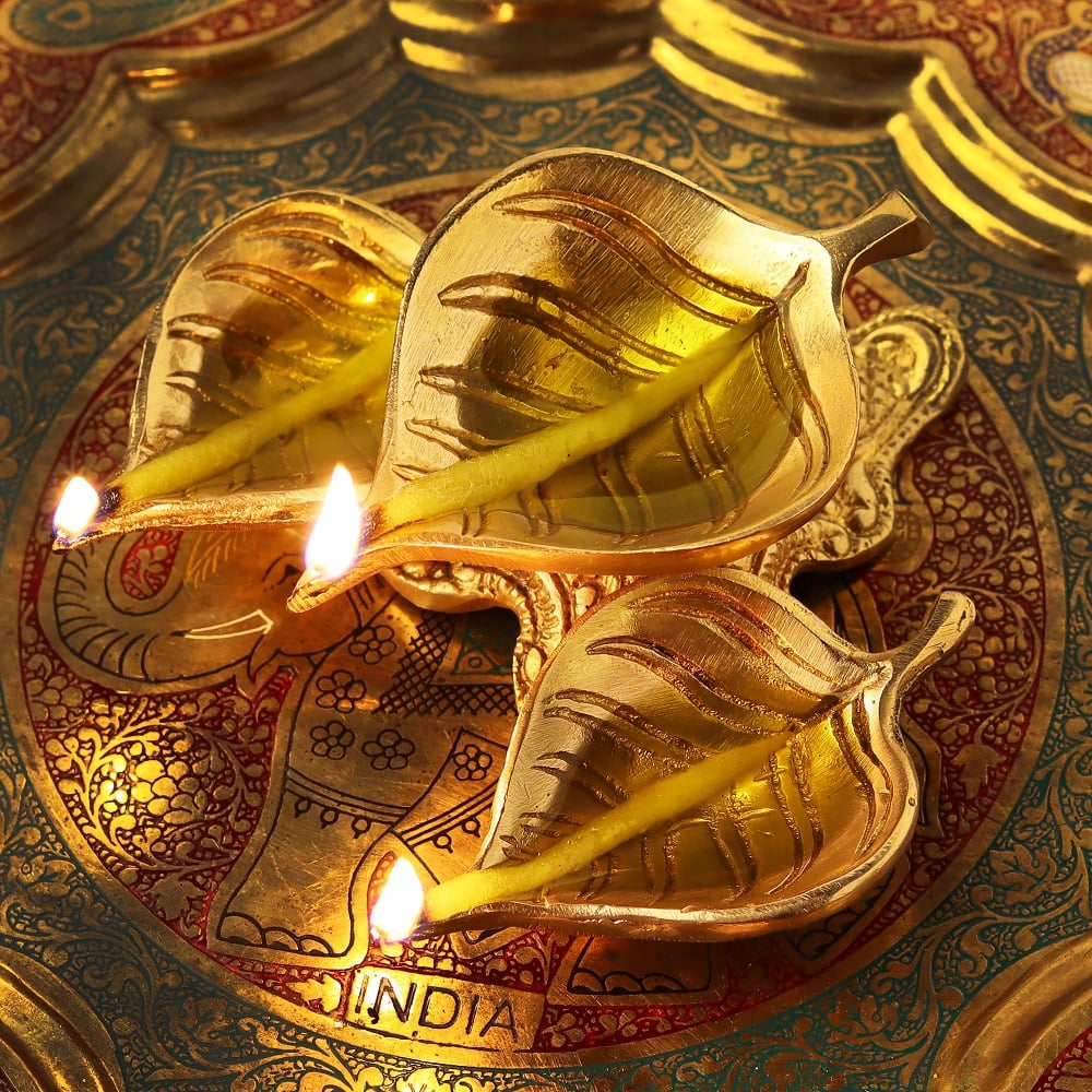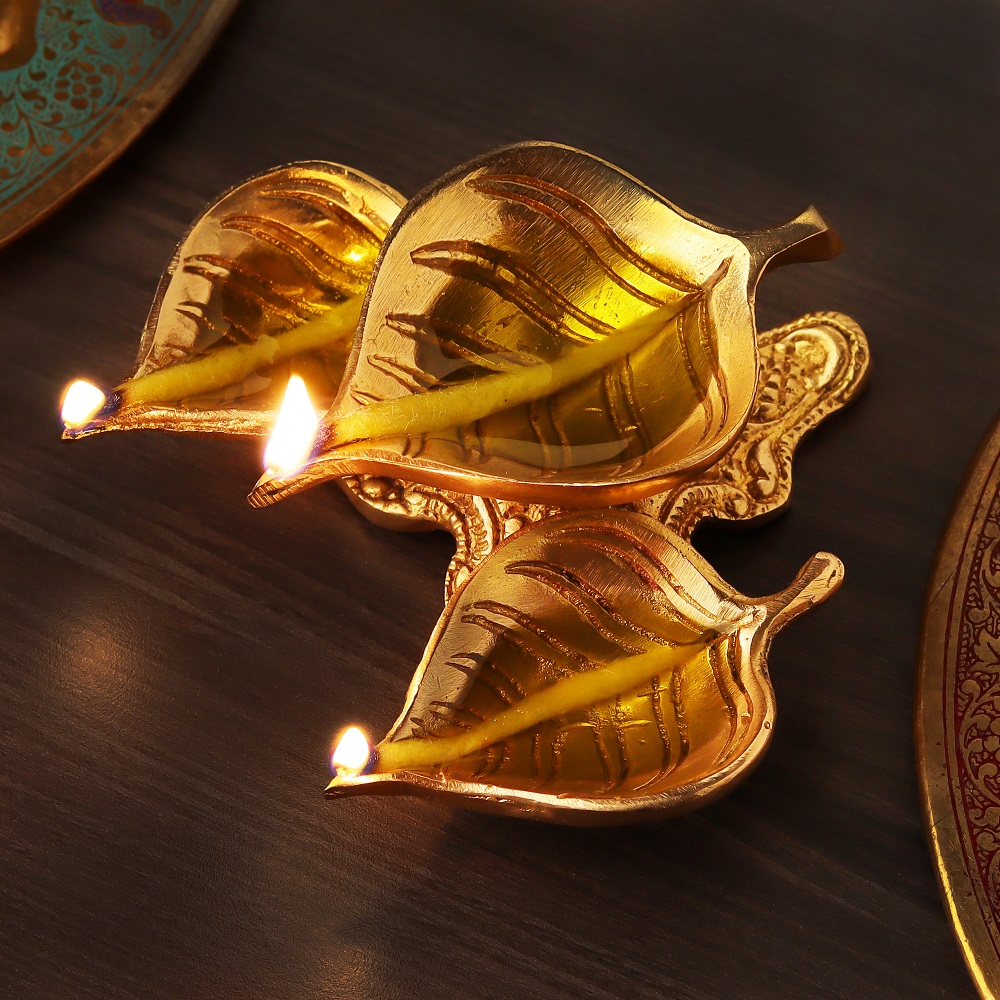 Enhance your Diwali celebrations with the beautiful Golden Brass Leaf Shaped Oil Lamp. This intricately designed lamp, crafted from premium brass, showcases a distinctive three-leaf motif that embodies prosperity, happiness, and peace. Its brilliant golden finish brings a luxurious touch to your festive decor while honoring the spiritual significance of the occasion. Ideal for Pooja ceremonies, this oil lamp will illuminate your home with warmth and light.
