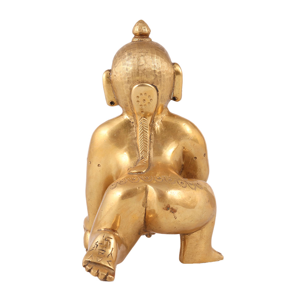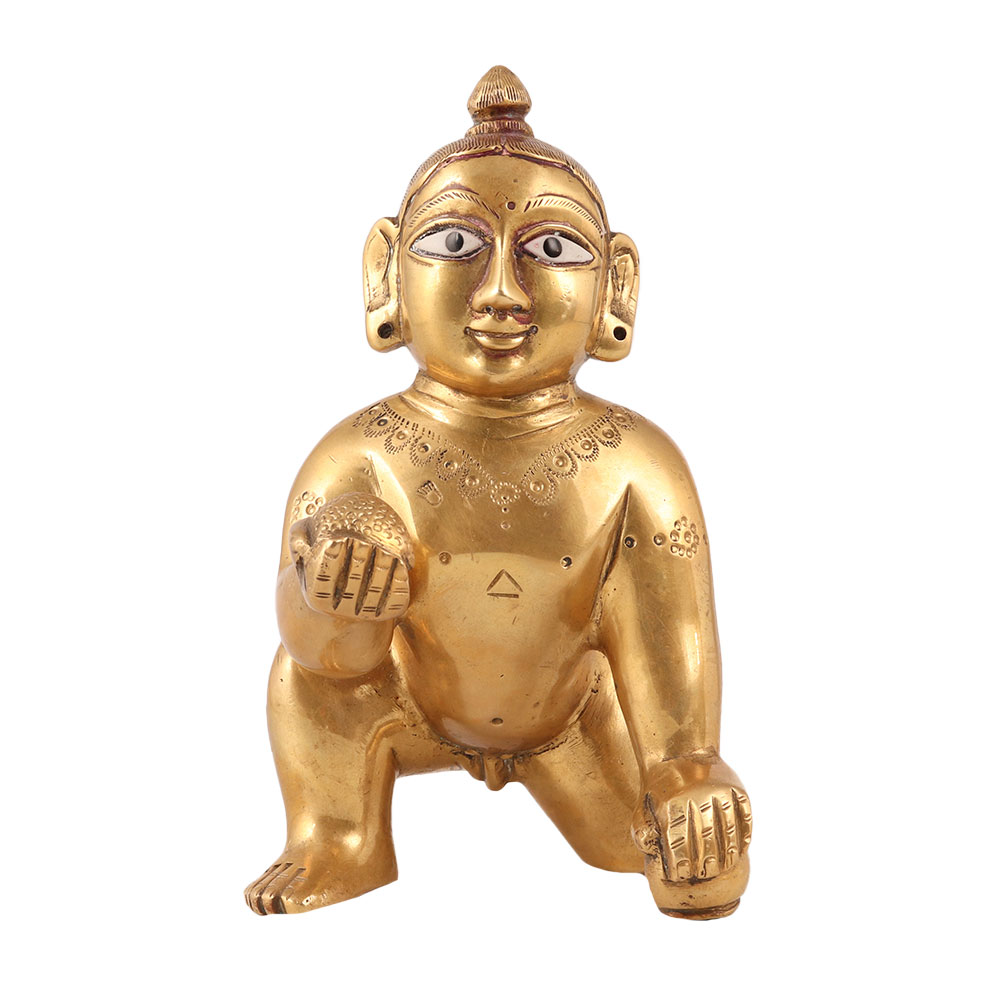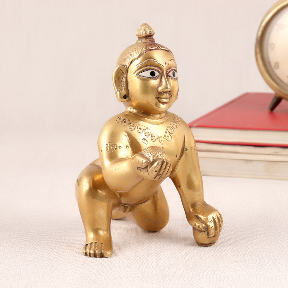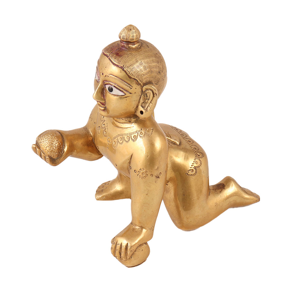Buy a golden brass statue of baby Lord Krishna in a crawling position which is a true work of art that's perfect for worship, decoration, and collection. The intricate details and exquisite craftsmanship that went into creating this piece are truly remarkable. The statue's design, featuring baby Lord Krishna in a crawling position, is a symbol of innocence and purity, making it an ideal addition to any space where peace and tranquillity are desired. It's a unique and distinctive piece that's sure to impress any collector of decorative items. Display it in a prayer room or as part of a larger collection and this brass statue is sure to become a treasured piece. An auspicious gift for special and festive occasions to your loved ones.