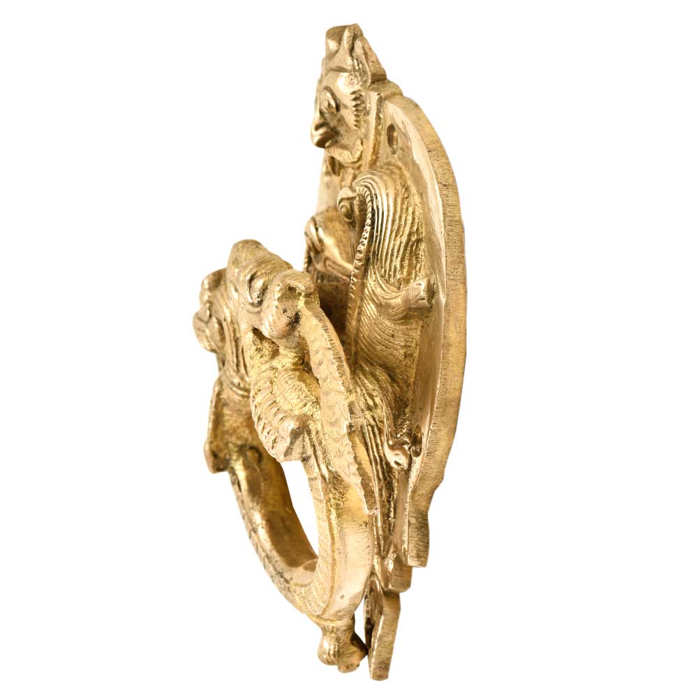 A very heavy door knocker in brass with a demon face on top with two intricately designed peacocoks on the knocker ring . Made by expert craftsmen of india using old traditional methods. The Brass door knocker has a brass ring that is banged on plate of the door knocker to produce the knocking sound. Lovely home decoration product and a wonderful gifting option for friends and family.