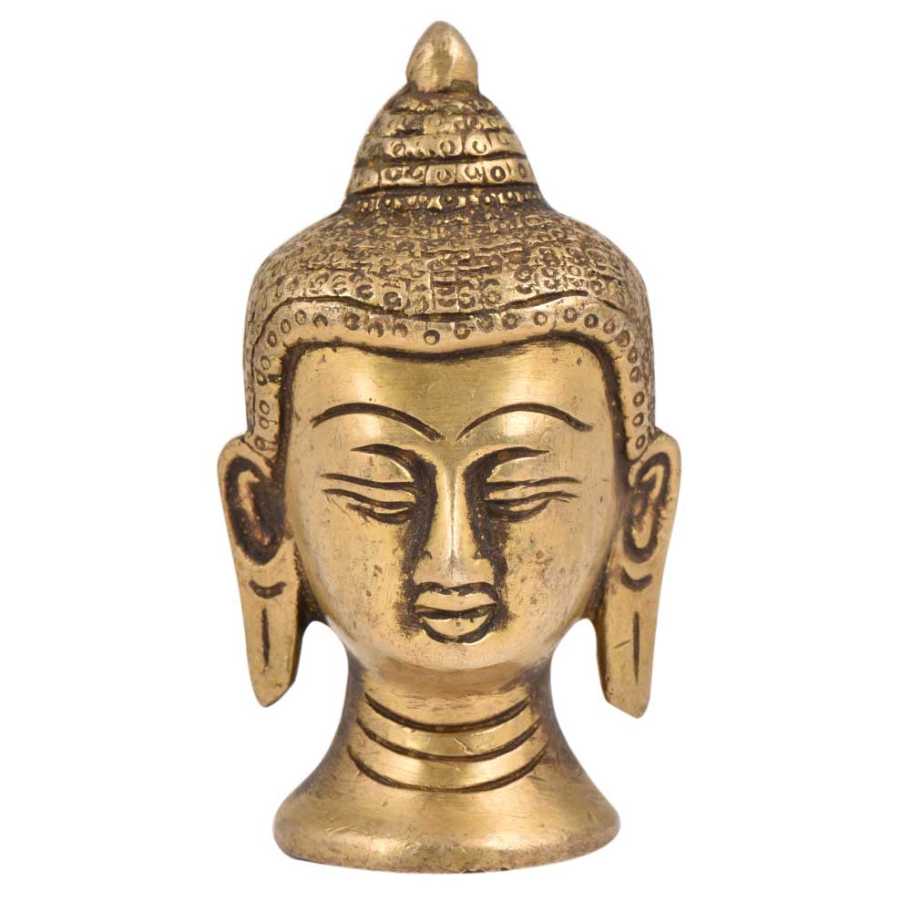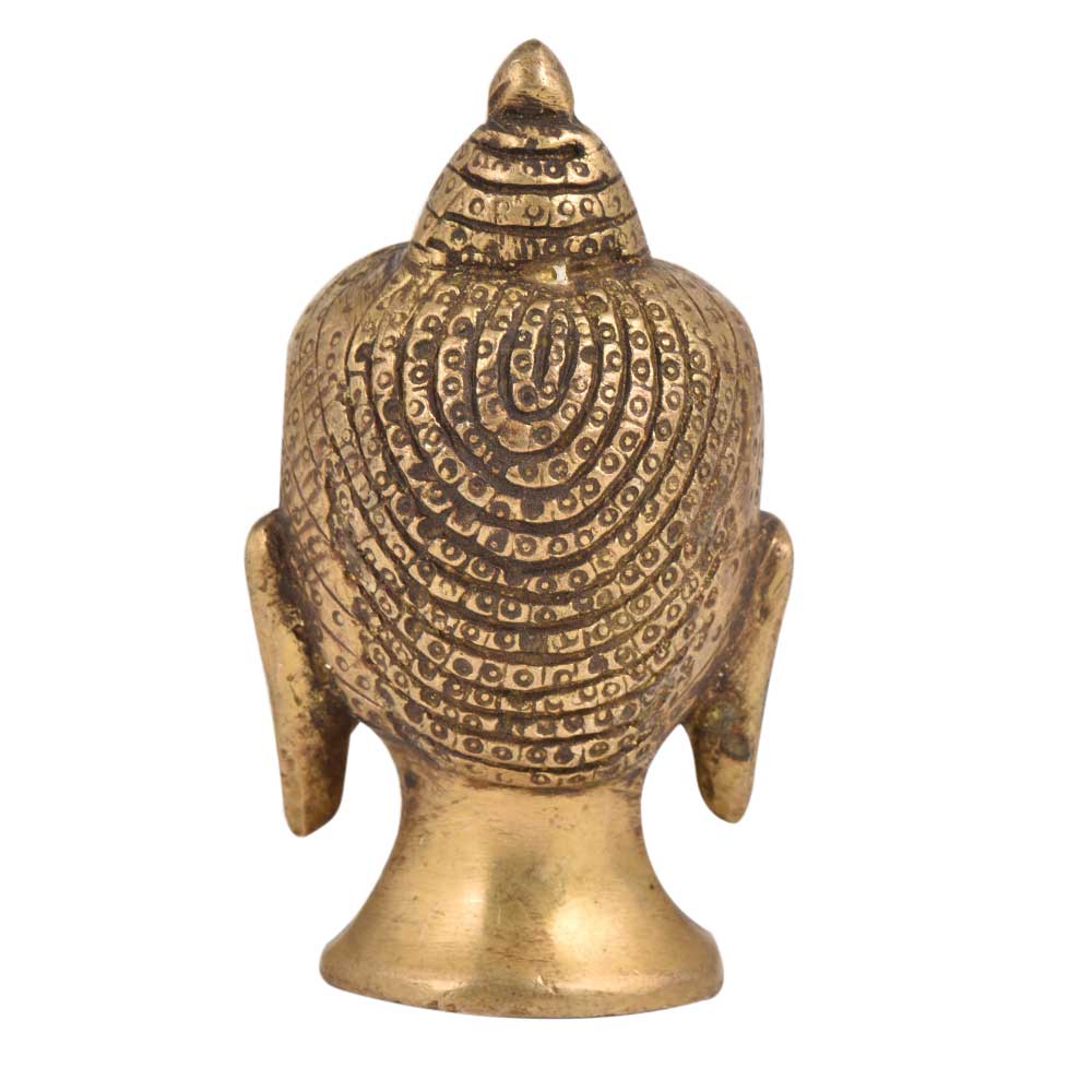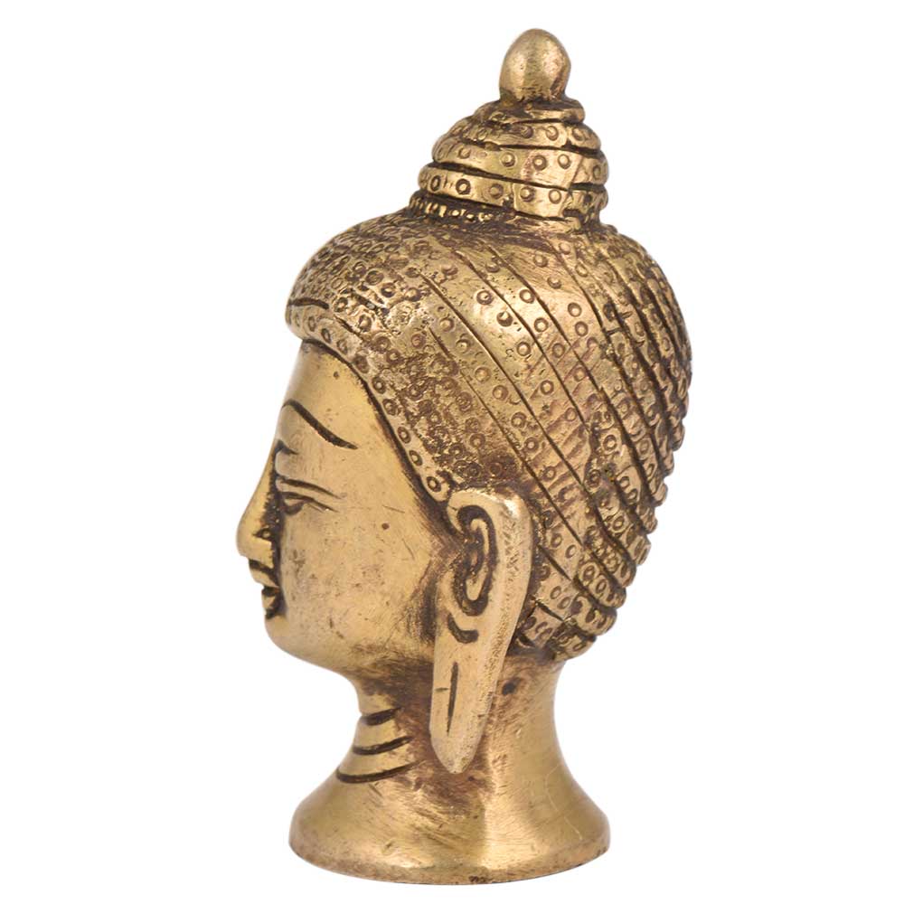 A very Peaceful golden brass Buddha face head statue with curly hair tied in a bun and eyes closed in meditation with long hanging earlobes. Gift it to your near and dear ones on diwali, new year , Christmas, new year, wedding gift, birthday gift or house warming gift.