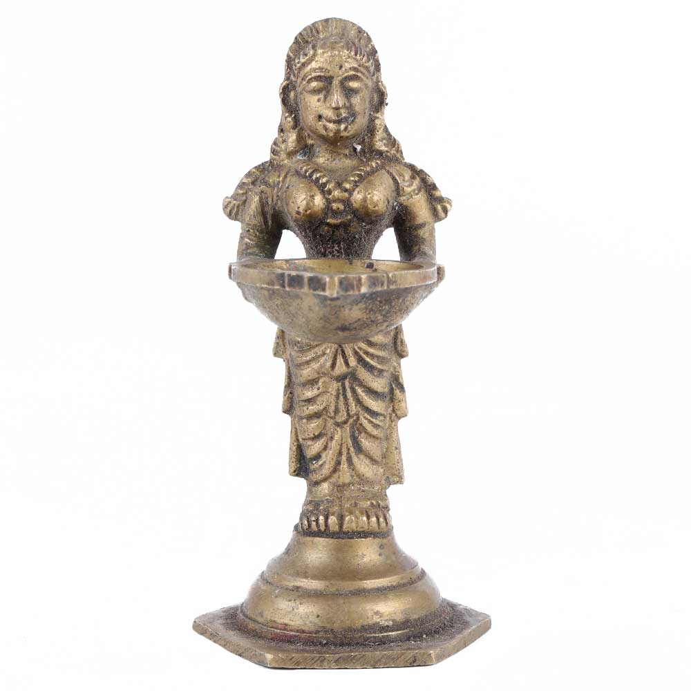 The brass golden deep laxmi holding a diya in her palm is a high-quality brass oil lamp that makes a wonderful return present for housewarmings, weddings, pooja functions, diwali parties, Ganesh Chaturthi, and Navratri.